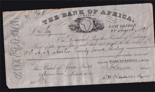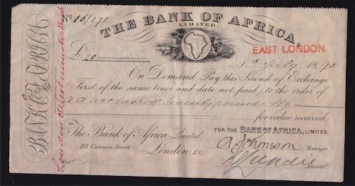 Lot of 5 South Africa Bank Treasury Bills - Lot includes: 1895 Twenty Pounds Sterling, No16/209; 1895 Twenty Pounds, No 22/23; 1895 Twenty Pounds, No 16/171; 1895 Thirty Pounds, No 16/121; 1894 Twenty Pounds, No 15/175. 5 Pcs.