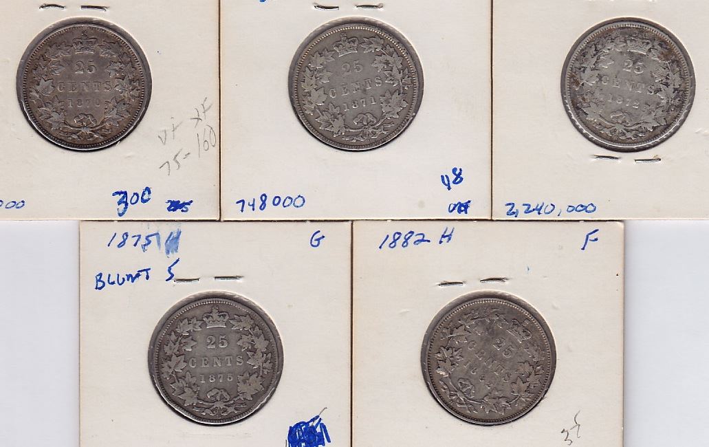 Lot of 5 Twenty Five Cents Includes: 1870 Fine+; 1871H VG; 1872H VG; 1875H VG; 1882H Fine. 5 Pcs.