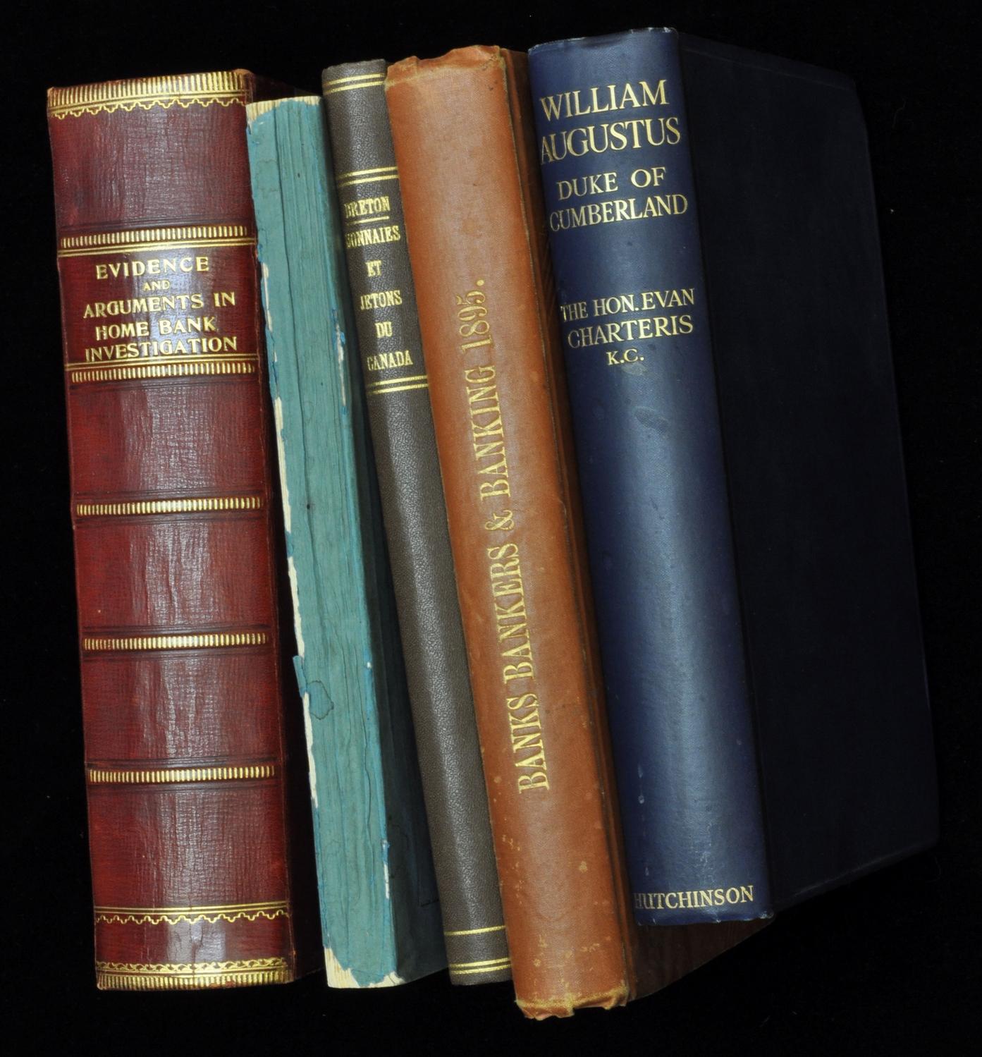 Evidence and Arguments in Home Bank Investigation 1st Edition 1924, in Good condition; William Augustus Duke of Cumberland The Hon. Evan Charteris K.C. 1st Edition, No Publication Date, Canadian Content, Very Good condition; Shareholders in the Chartered Banks of the Dominion of Canada 1st Edition, 1884; Illustrated History of Coins and Tokens Relating to Canada, Good condition; Garland's Banks Bankers and Banking and Financial Directory of Canada 1895, in Fair condition.*