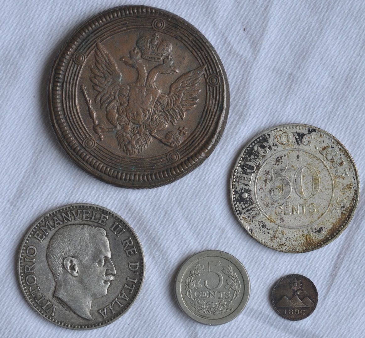 Lot includes: 1909 Netherlands 5 Cents, KM137, VF. 1805 Russia 5 Kopeks, aVF. 1896 Guatemala 1/4 Real, AU. 1912 Italian Somalialand One Rupee, F/VF. 1893 Hong Kong Fifty Cents, VF. 5 Pcs.