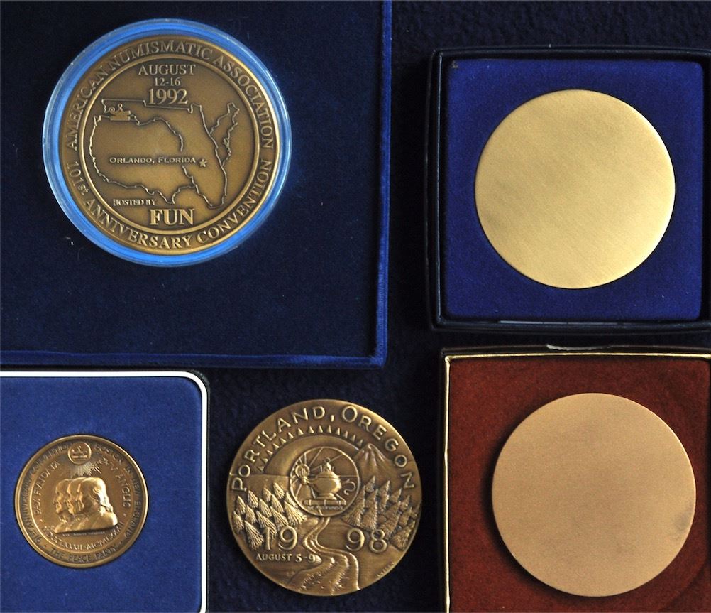 Lot of 5 World Medals - Includes: American Numismatic Association 91st Anniversary Convention in Boston, in case of issue; American Numismatic Association 107th Anniversay Convention in Portland, Oregon, 1998; American Numismatic Association Medal, For Merit of Exhibit, Baltimore, Maryland. Aug 20-25, 1985, in case of issue; American Numismatic Association Medal, For Merit of Exhibit, Miami Beach, 1967, in box of issue; American Numismatic Association 101st Anniversary Convention in Orlando, Florida, Aug 12-15, 1992, in case of issue. 5 Pcs.