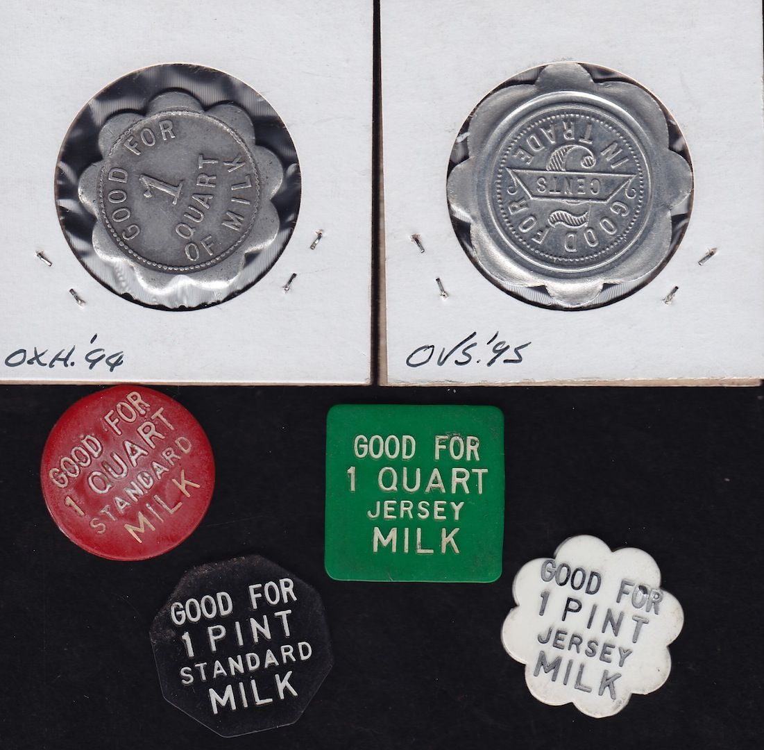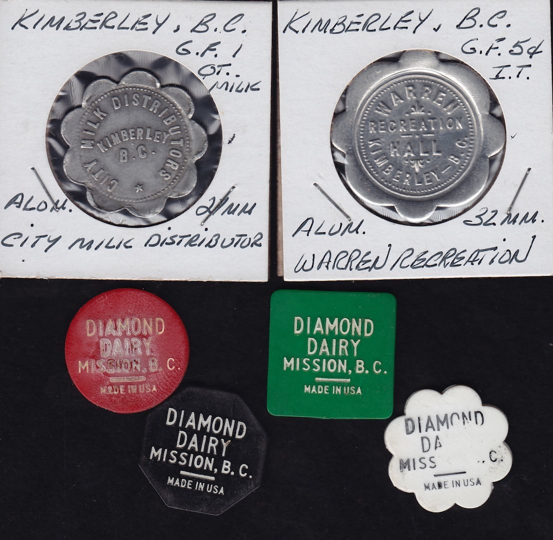 Lot of 6 British Columbia Trade Tokens. Includes: Kimberley, BC, City Milk Distributors, 1 quart, VF, aluminum, Kimberley, BC, Warren Recreation Hall, 5 cents, UNC, aluminum, Diamond Dairy, Mission, BC, 4 plastic pcs, 1 pint standard, 1 quart standard milk, 1 pint jersey milk, 1 quart jersey milk. 6 Pcs.