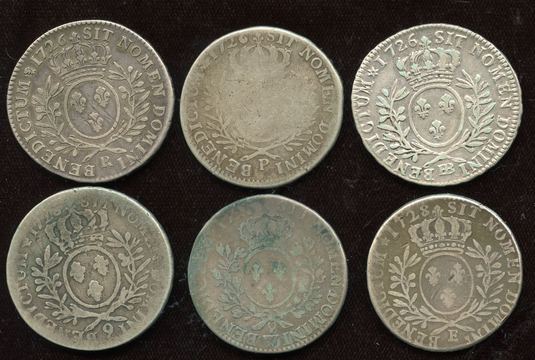 aux lauriers, 1726BB, aVF; 1726P, Good; 1726R, Fine; 1728E, VG+; 1728 9, VG; all G & D 313; ½ Ecu au bandeau, Louis XV, 1746W, aVG, G & D 314. 6 Pcs.