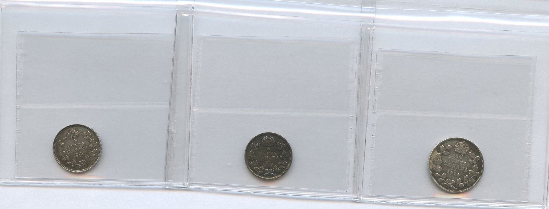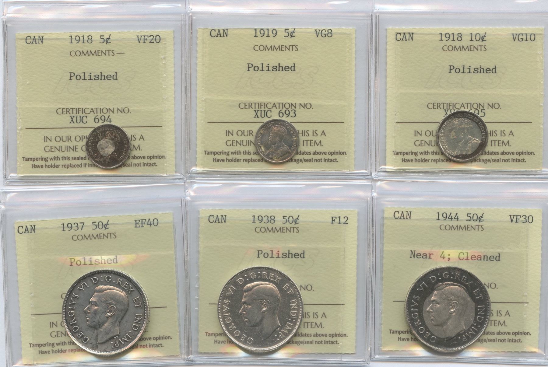 This lot is cleaned or polished, includes: 1918 Five Cents, VG10. 1918 Five Cents, VF20. 1919 Five Cents, VG8. 1937 Fifty Cents, EF40. 1938 Fifty Cents, F12. 1944 fifty Cents, VF30. 6 pcs.