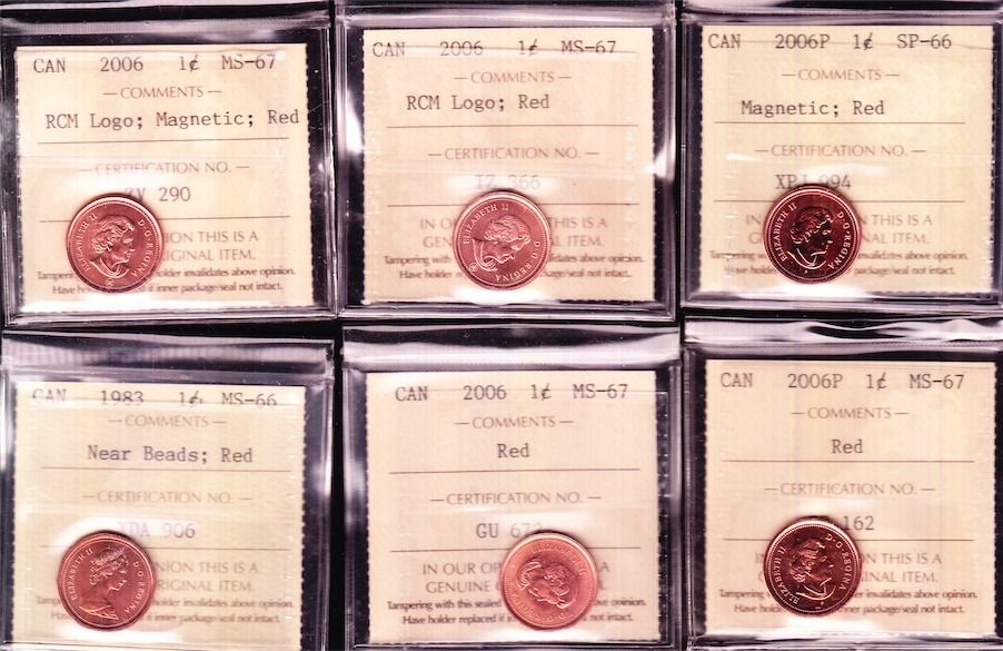 Lot of 6 ICCS Graded One Cents - Includes: 1983 Near Beads, MS-66 Red; 2006 MS-67 Red; 2006P Magnetic MS-67 Red; 2006P Magnetic SP-66 Red; 2006 RCM Logo MS-67 Red; 2006 RCM Logo Magnetic MS-67 Red. 6 Pcs.