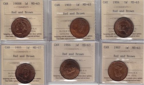 Dates include: 1900H MS-63 Red and Brown. 1903 MS-63 Red and Brown. 1904 MS-63 Red and Brown. 1905 MS-63 Red and Brown. 1906 MS-63 Red and Brown. 1907 MS-63 Red and Brown. 6 Pcs.