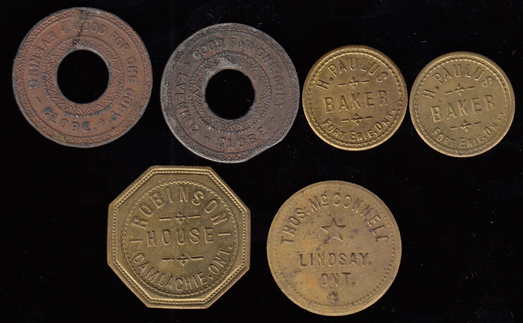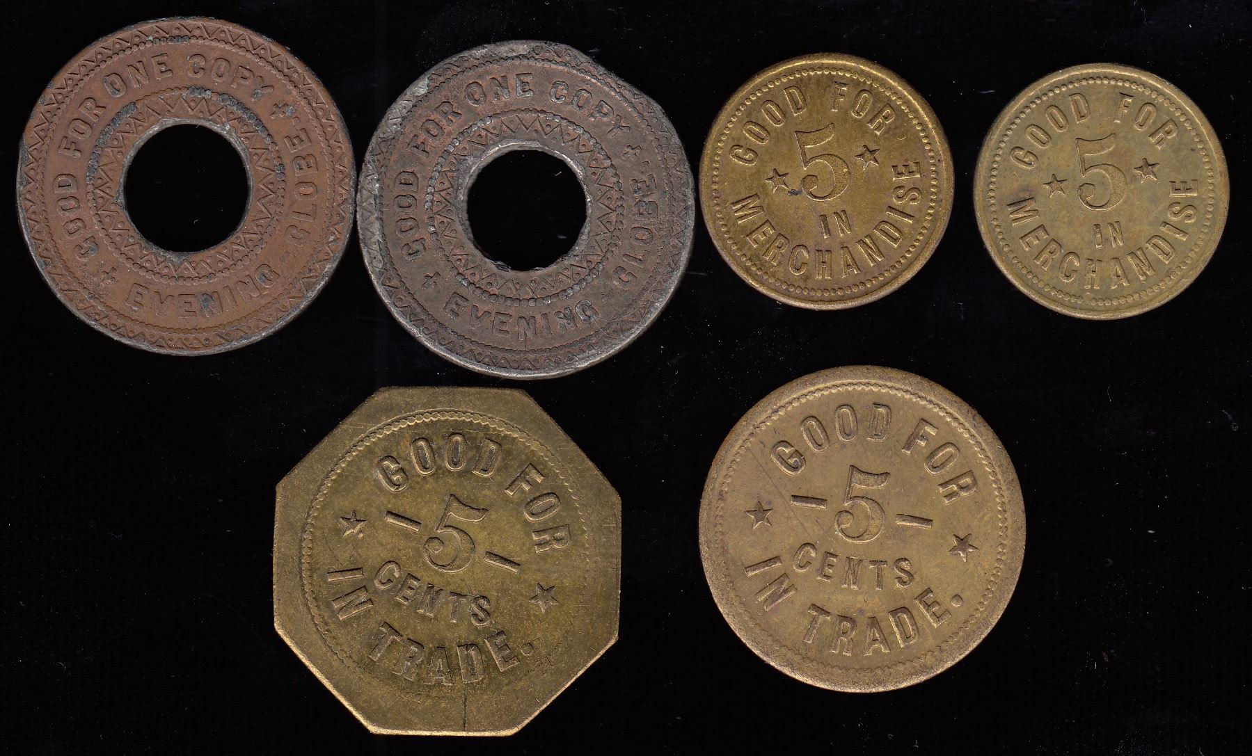 Br. 755, Evening Globe, abt EF; another, Fine; Br. 760, H. Paulus, 5?, brass, BU; another, Unc; Br. 762, Robinson House, 5?, brass, BU; Br. 764, Thos. McConnell, 5 cents, brass, Unc. lustre. 6 Pcs.