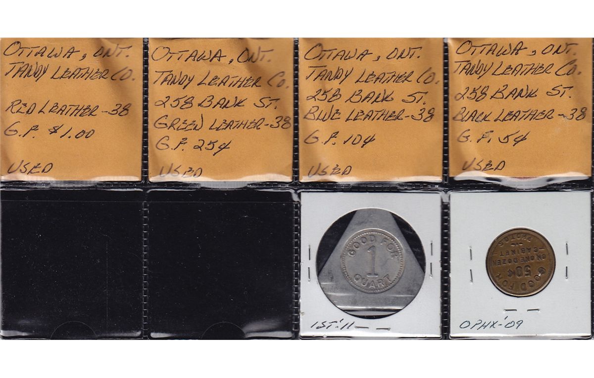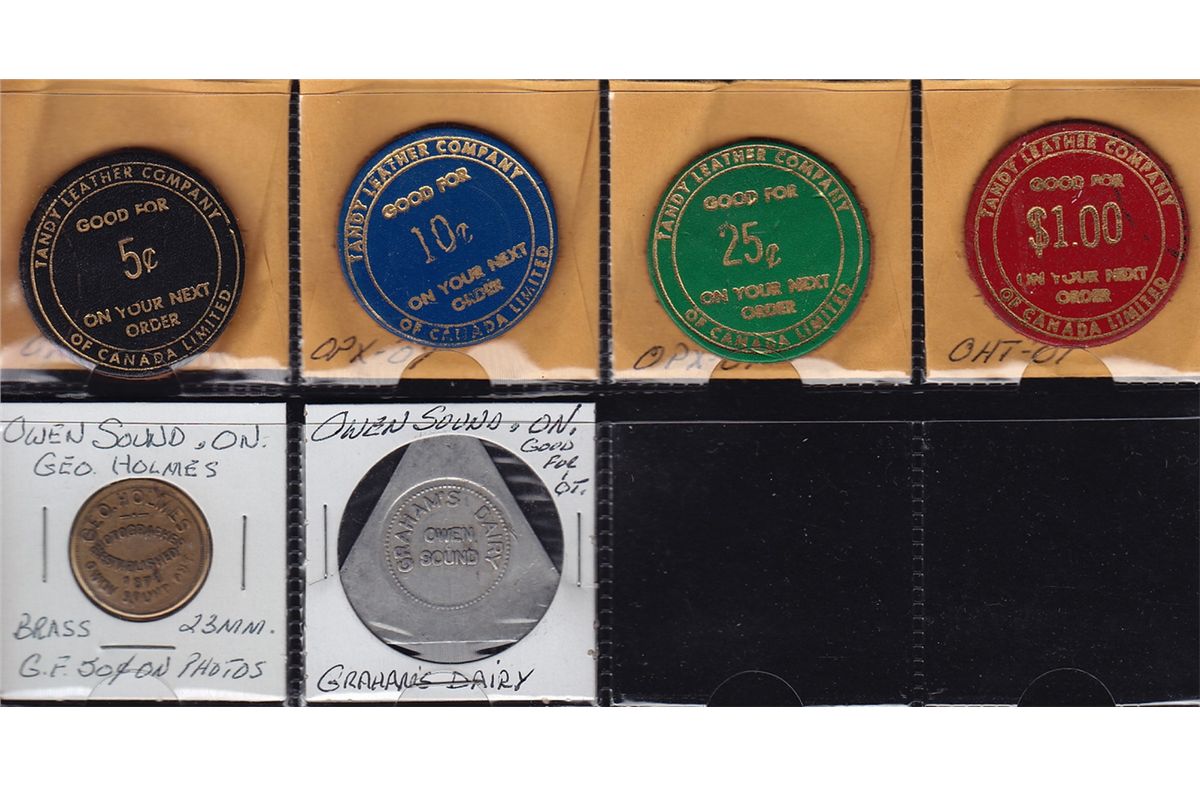 Lot of 6 Ontario Trade Tokens. Tandy Leather Co., Ottawa, ON, 5, 10, 25 and $1.00, Geo. Holmes, Owen Sound, leather, UNC, 50 cents, brass, VF, Graham's Dairy, Owen Sound, 1 quart, aluminum, VF. 6 Pcs.