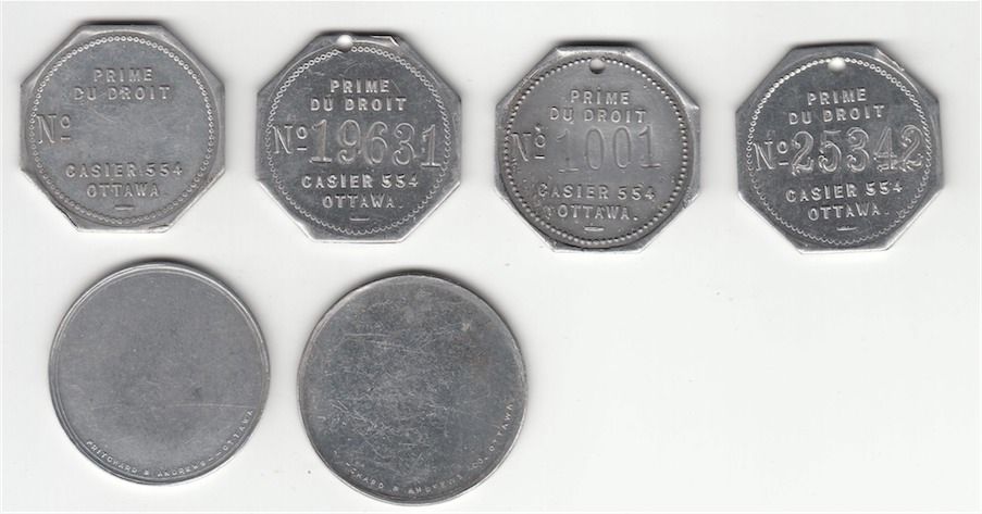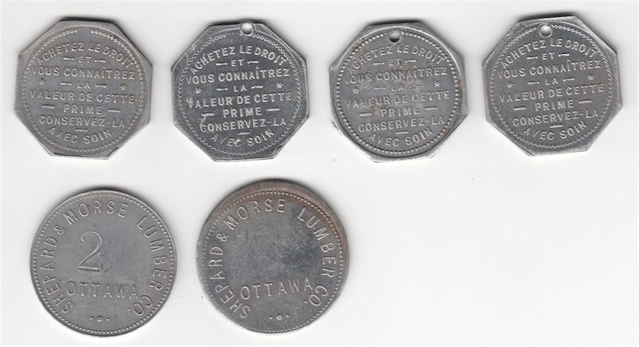 Lot of 6 Ottawa Tokens. Includes: Four Du Droit newspaper tokens. Rev: no numbers, 1001, 19631 and 25342. Two Shepard & Morse Lumber Co. tokens. Rev: Pritchard & Andrews - - Ottawa. One has a number 2 counterstamped above Ottawa. VF to EF. 6 Pcs.