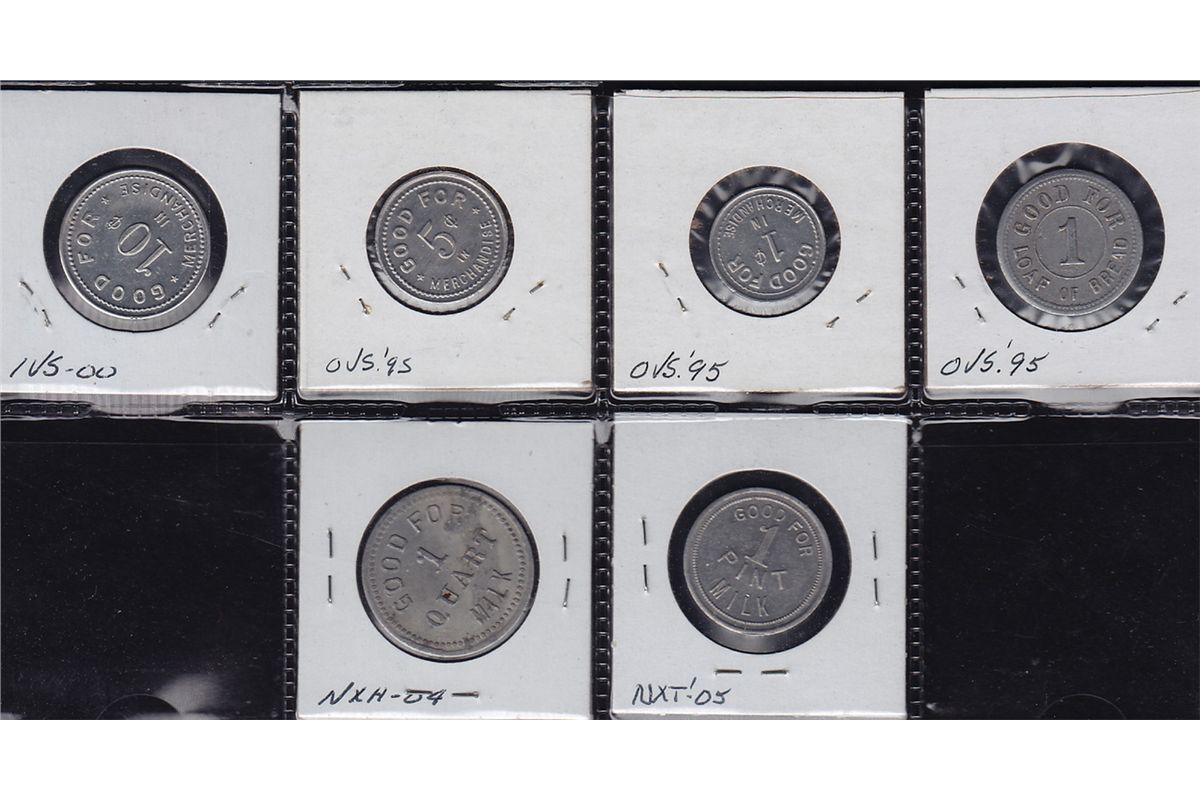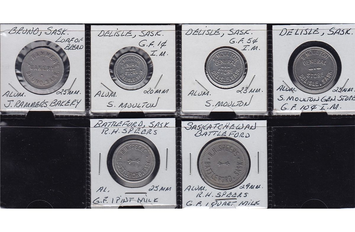 Lot of 6 Saskatchewan Trade Tokens. Includes: Battleford, SK, R.H. Speers, 1 pint and 1 quart, EF, aluminum, Bruno, SK, J. Rammer's Bakery, 1 loaf, EF, aluminum, Delisle, SK, S. Moulton, 1, 5 and 10 cents, UNC, aluminum. 6 Pcs.