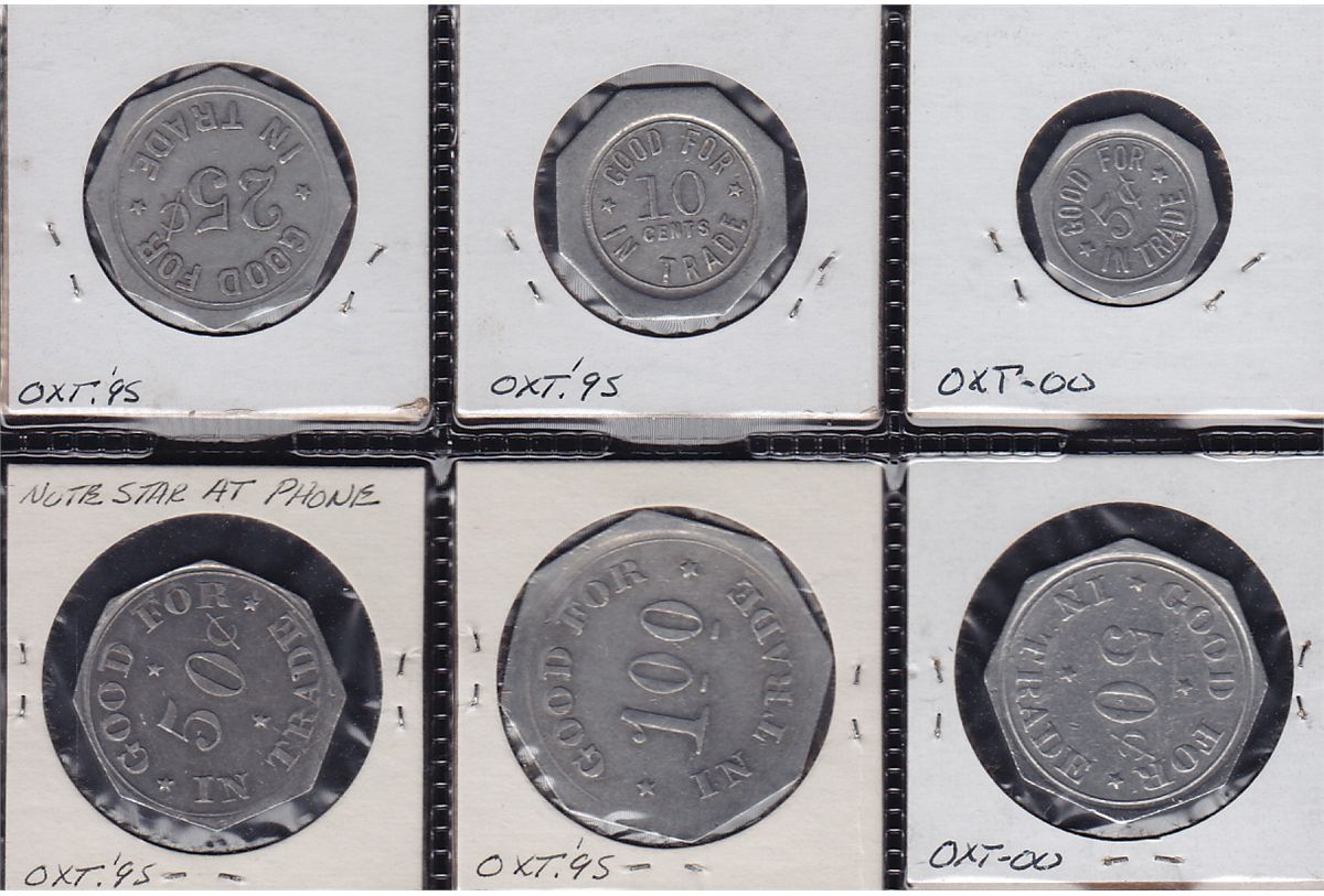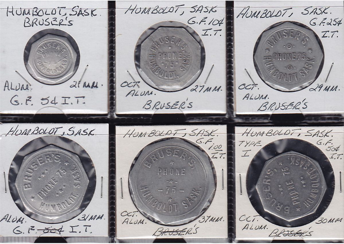 Lot of 6 Saskatchewan Trade Tokens. Includes: Humboldt, SK, Bruser's, 5, 10, 25, 50 x2 and $1.00, VF, all octagonal, aluminum. 6 Pcs.