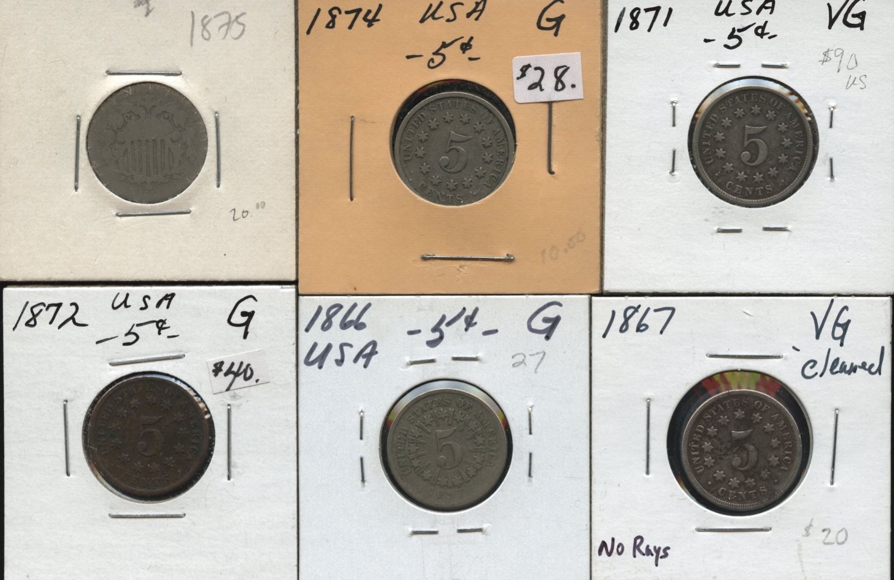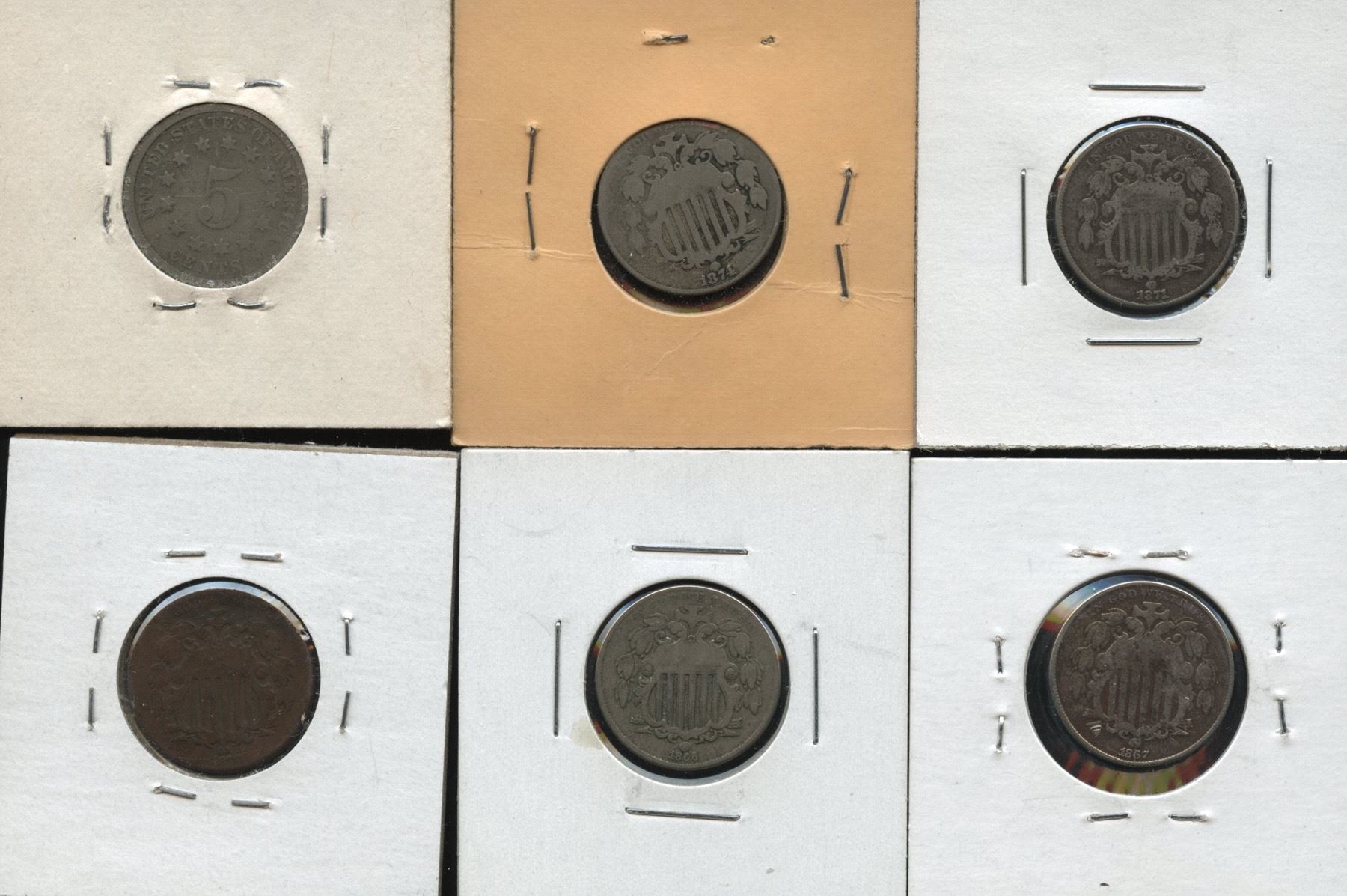 Lot of 6 USA Shield 5c: 1866, 1867, 1871, 1872, 1874, 1875