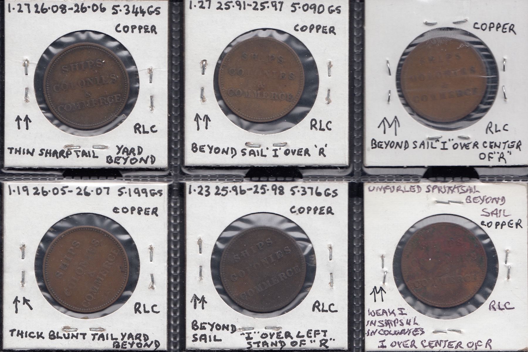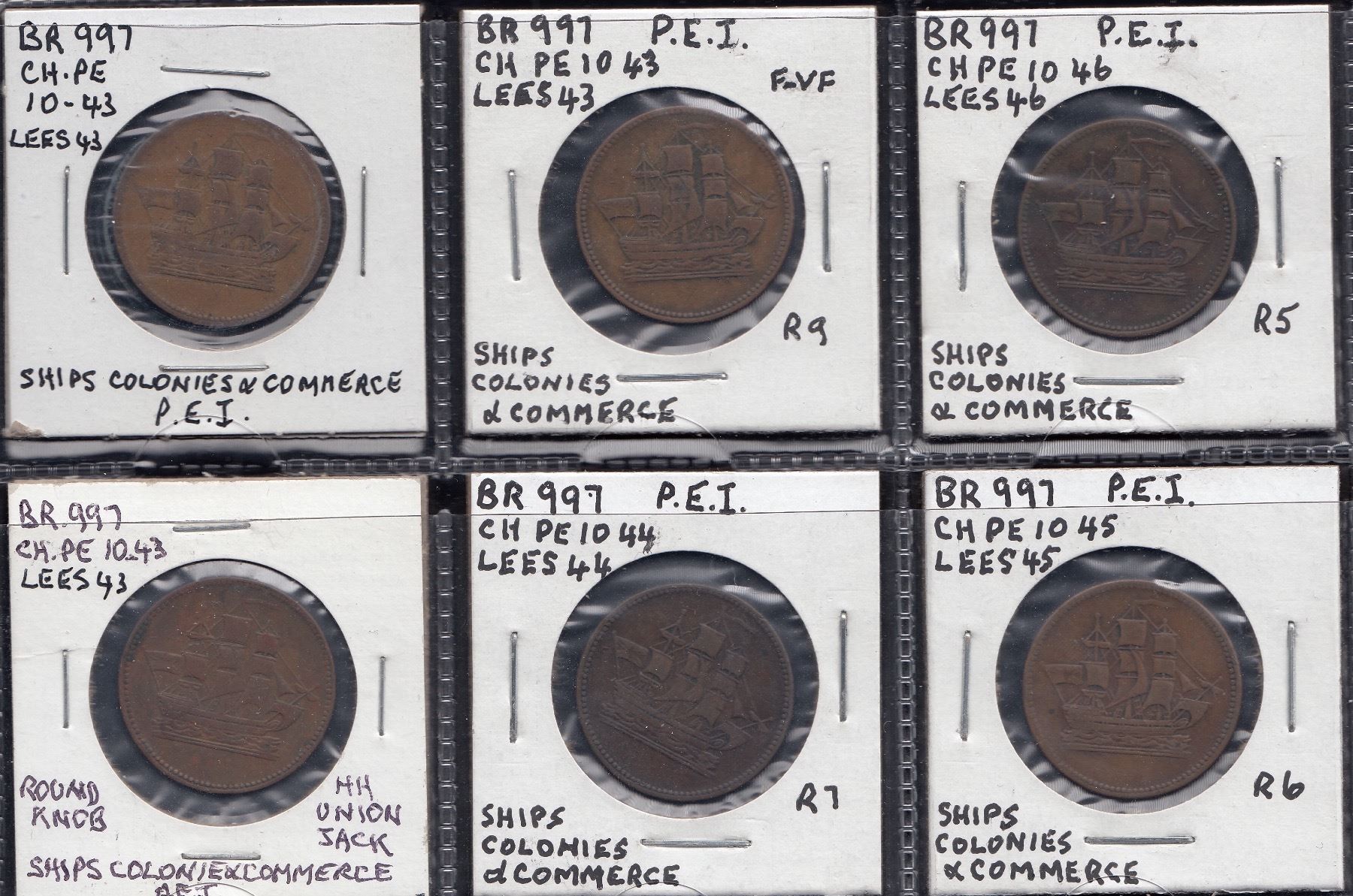 Lees 43, PE-10-43 (2 w/o die break, 1 with break); Lees 44, PE-10-44 (1); Lees 45, PE-10-45 (1); Lees 46, PE-10-46 (1). Fine-VF. 6 Pcs.