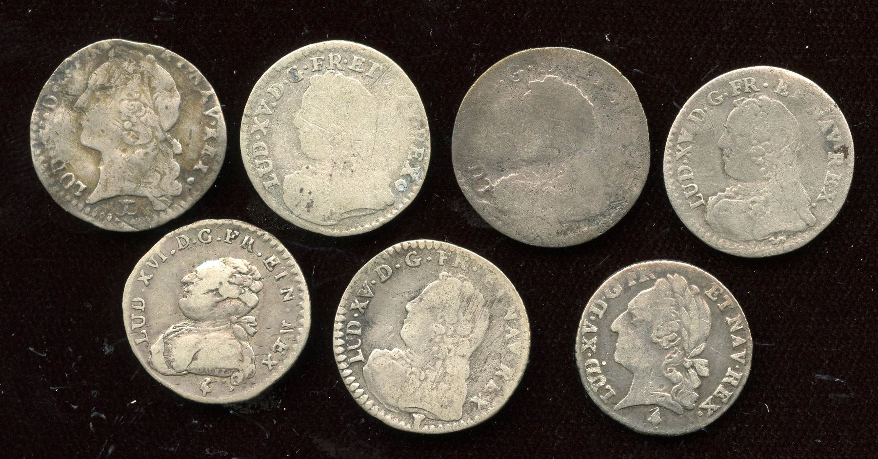 aux lauriers, Louis XV, 1726A, 1727BB, 1727E, 1727[?], 1729 (but an engraving error reads 1779), A, 2eme semester, 1730 9; Louis XVI, 1783A. G & D 283 and 352. Scarce coins, a couple Fine, but most VG. 7 Pcs.