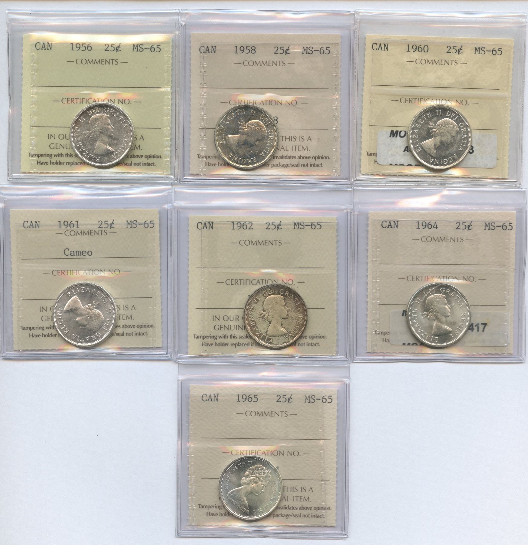 Includes: 1956 ICCS MS-65; 1958 ICCS MS-65; 1960 MS-65; 1961 MS-65, cameo; 1962 MS-65; 1964 ICCS MS-65; 1965 ICCS MS-65. 7 Pcs.