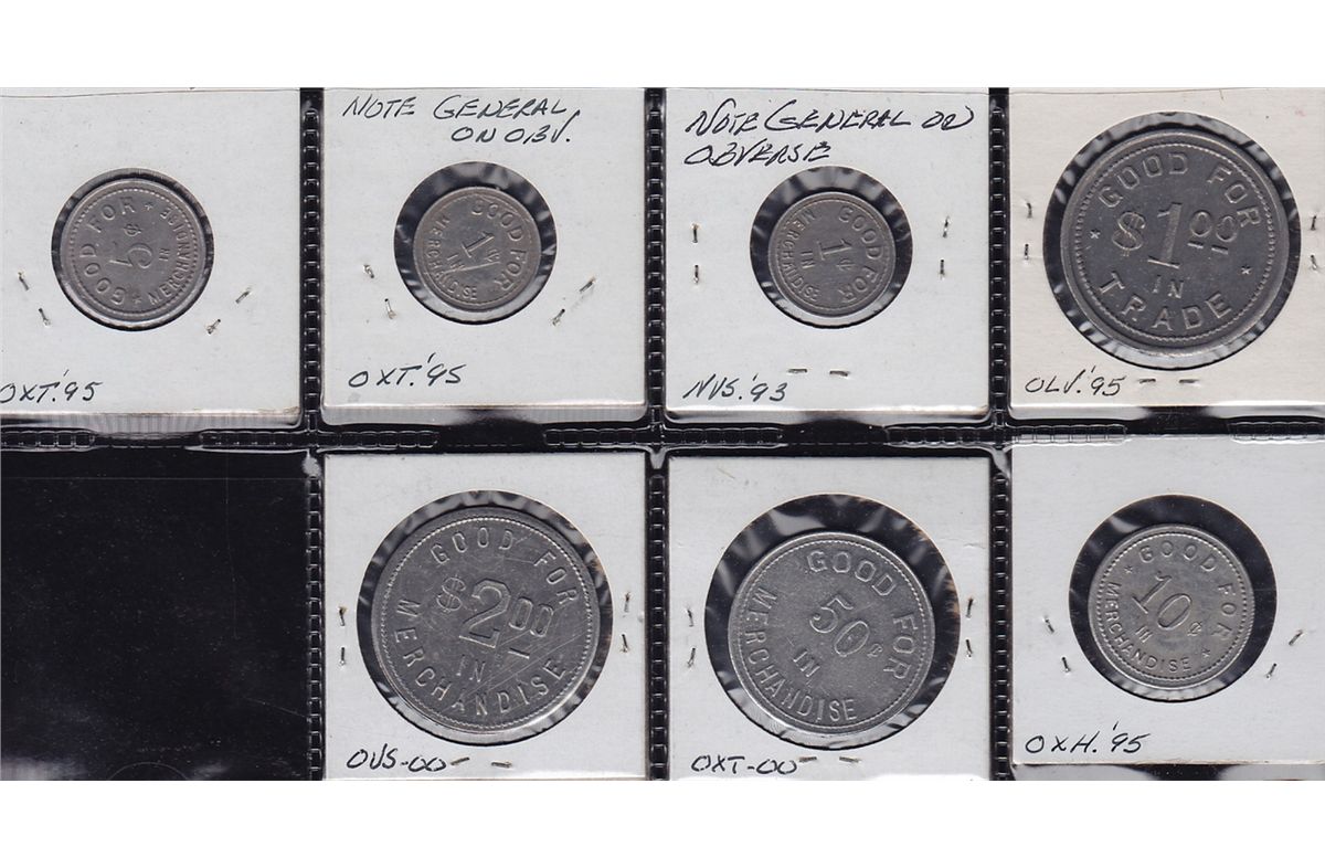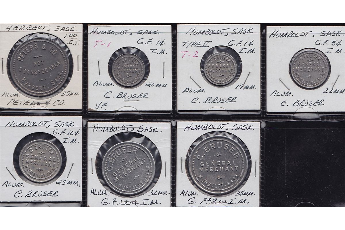 Lot of 7 Saskatchewan Trade Tokens. Includes: Herbert, SK, Peters & Co., $1.00, AU, aluminum, Humboldt, SK, C. Bruser, 1,(2) 5, 10, 50 and $2.00, all round variety, EF, aluminum. 7 Pcs.