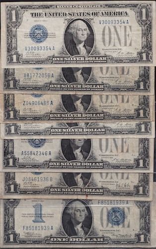 Lot of 7 USA Blue Seal $1 Silver Certificates - Includes: 6x 1928; 1934; Cetificates totalling over $200 in catalogue value. 7 Pcs.