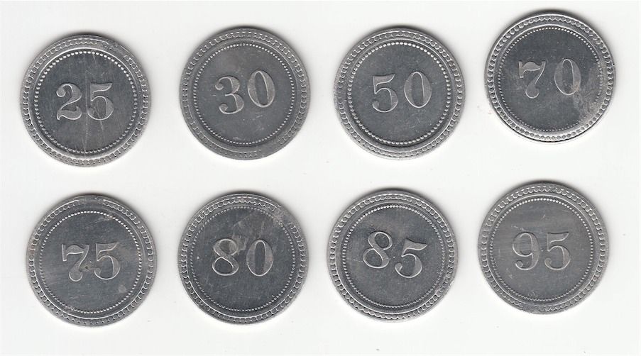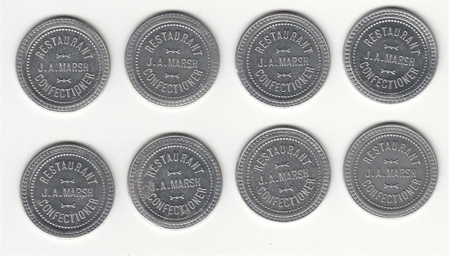 Lot of 8 Aluminum J.A. Marsh Restaurant tokens. The reverse numbers follow Bowman catalog numbers: Bo 84-A-B 95, Bo 84-A-D 85, 84-A-E 80, 84-A-F 75, 84-A-G 70, 84-A-K 50, 84-A-O 30 and 84-A-P 25. EF to Unc. 8pcs.