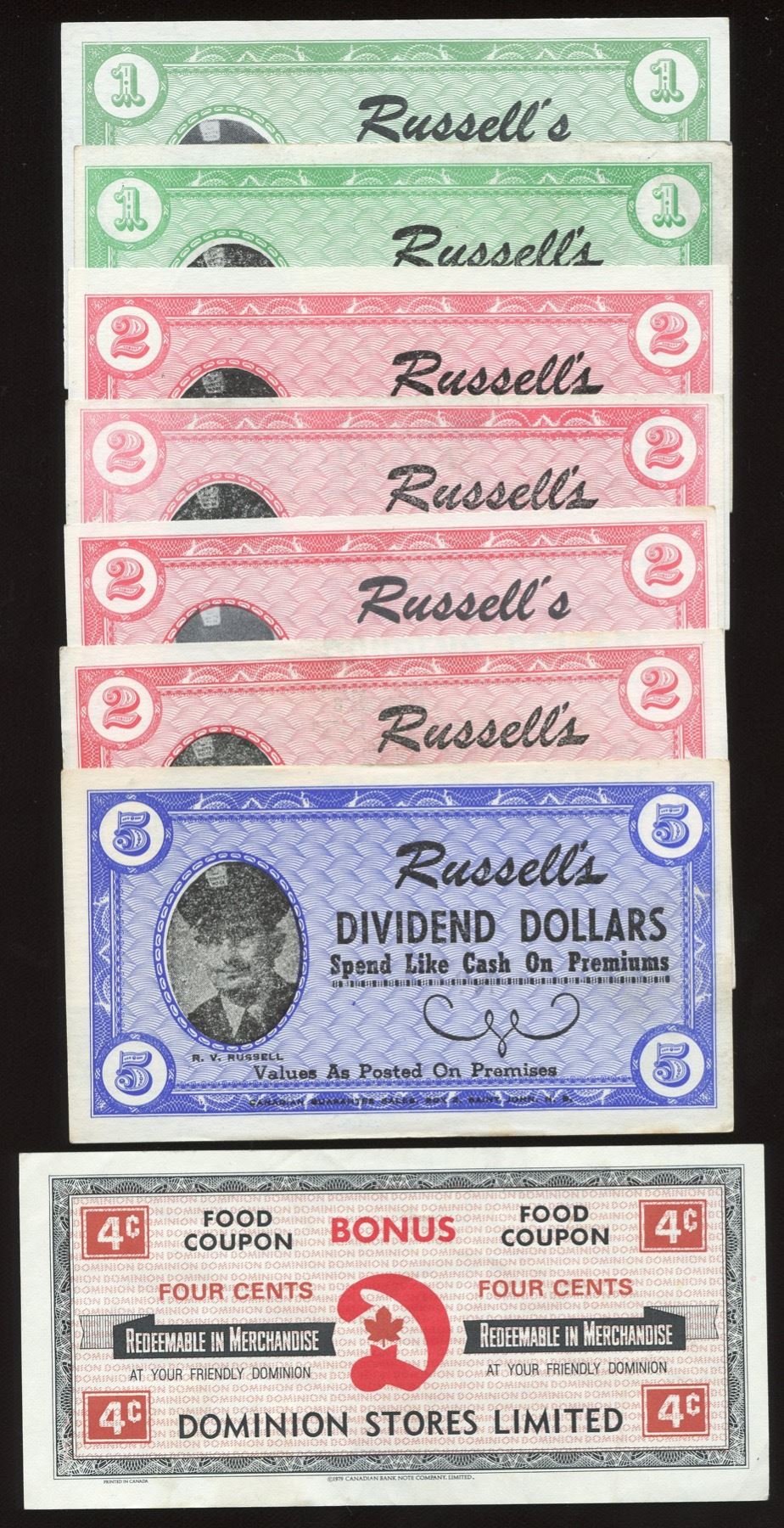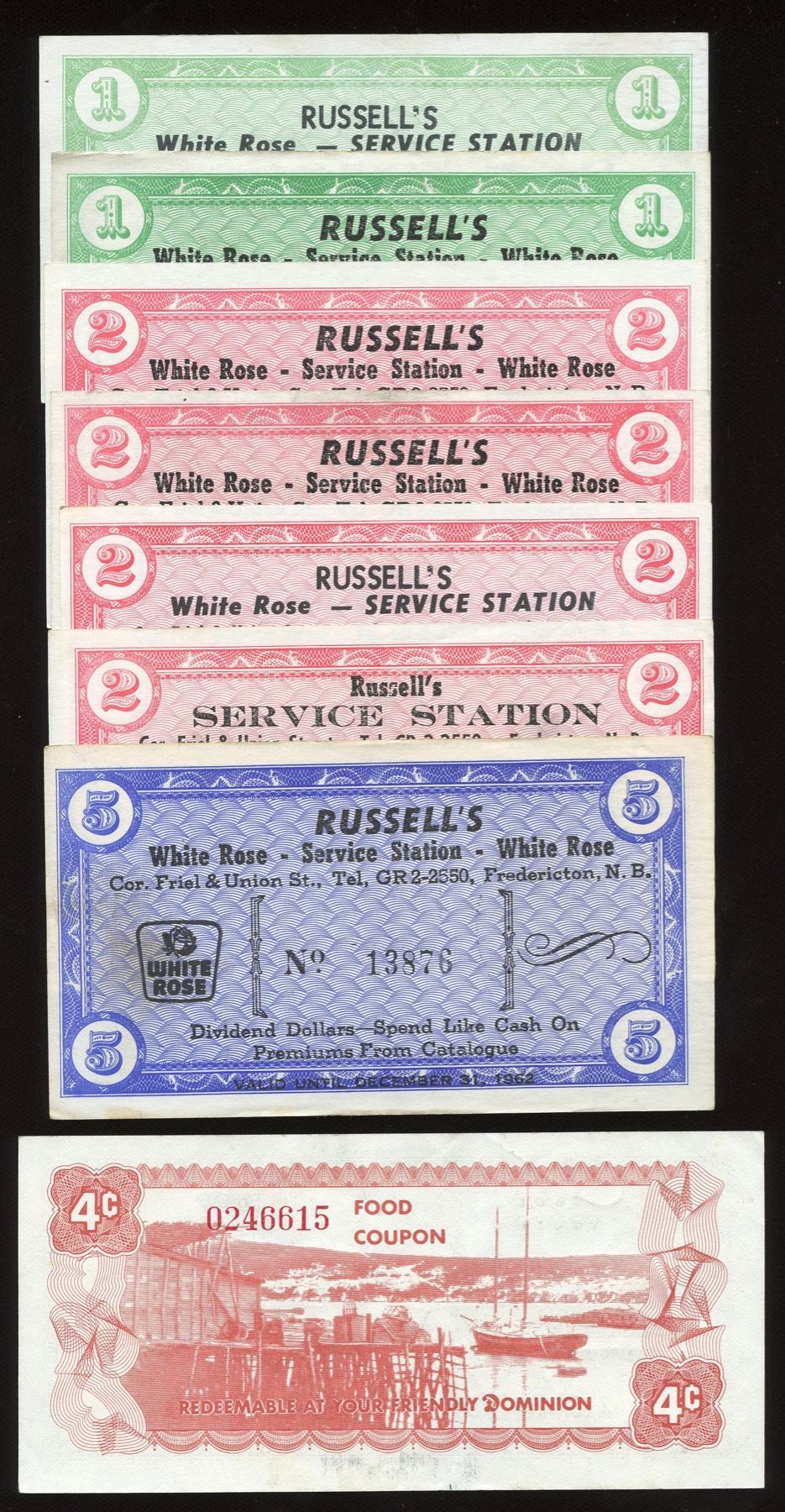 Includes Russell's White Rose Service Station, Fredericton, N.B. (7 pieces) and Dominion Stores Ltd. 4 Cents. We believe these to be fairly rare. 8 Pcs.