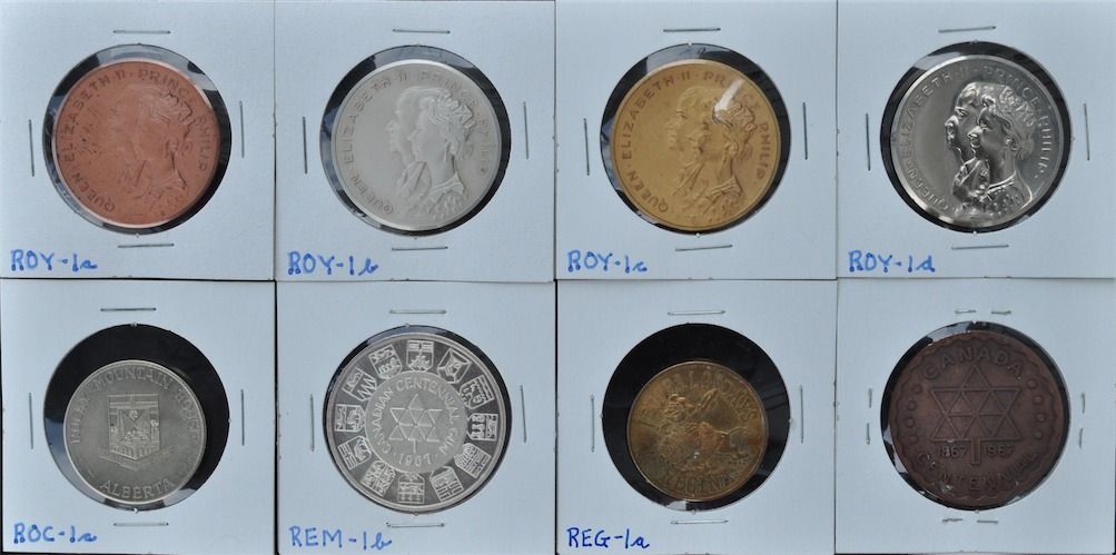 Lot of 8 Centennial Medals - Includes: Queen Elizabeth and Prince Phillip Set of four (ROY-1a,b,c,d), REM-1b, Buffalo Days (REG-1a), Rocky Mountain House (ROC-1a), Richmond Hill. 8 Pcs.