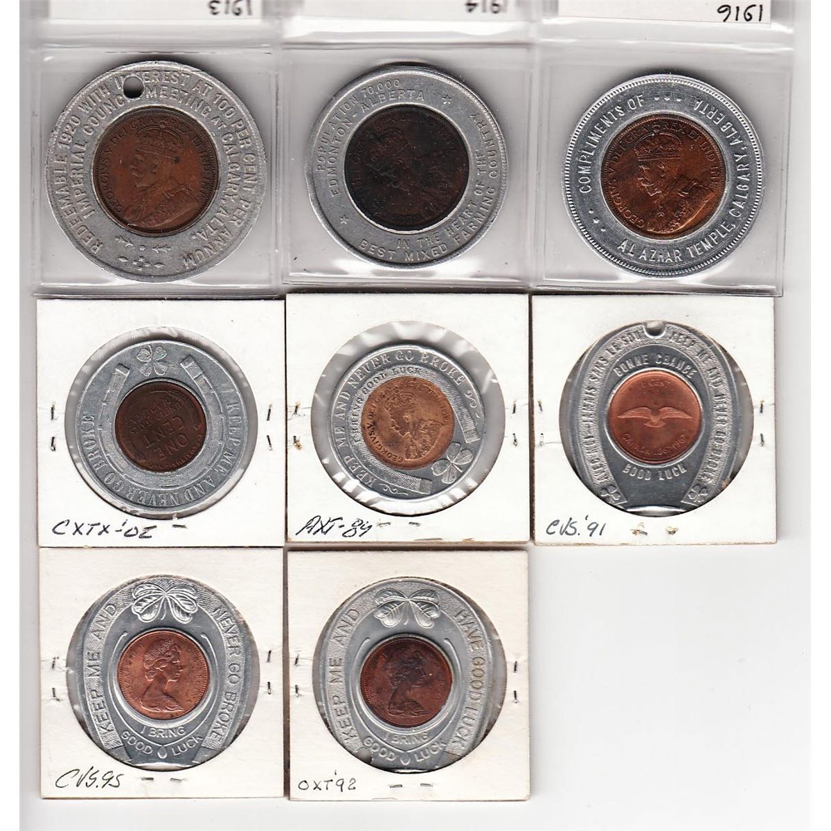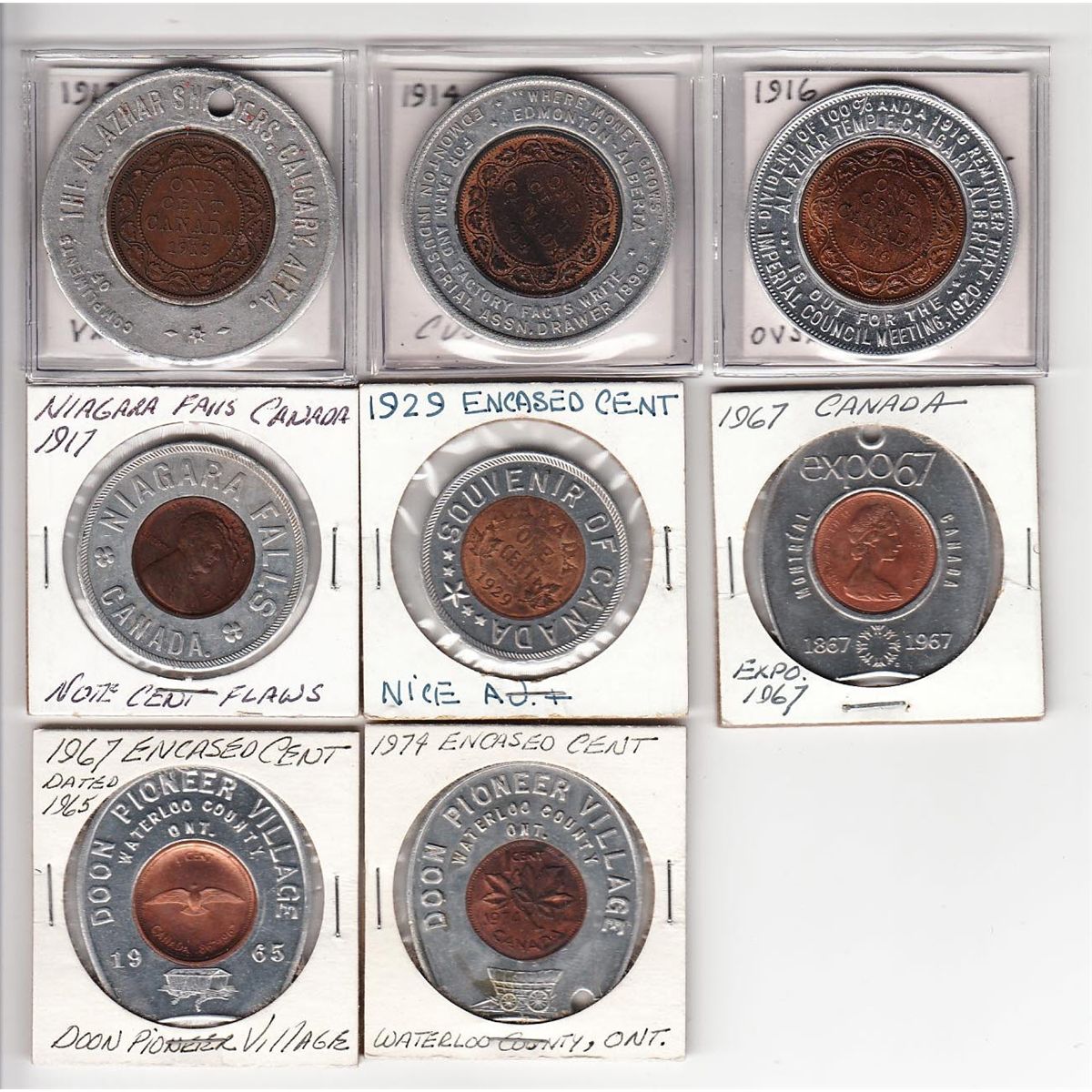 Lot of 8 Encased Coins. Includes: 1913 Canadian Large Cent The Al Azhar Shiners Calgary Alba., 1916 Canadian Large Cent The Al Azhar Shiners Calgary Alba., 1914 Canadian Large Cent Edmonton Industrial Assn., 1917 USA 1c Niagara Falls Canada, 1929 Canadian 1c Souvenir of Canada, 1867-1967 Canadian 1c Expo 67, 1867-1967 Canadian 1c Doon Pioneer Village, 1974 Canadian 1c Doon Pioneer Village. F-UNC. 8 Pcs.