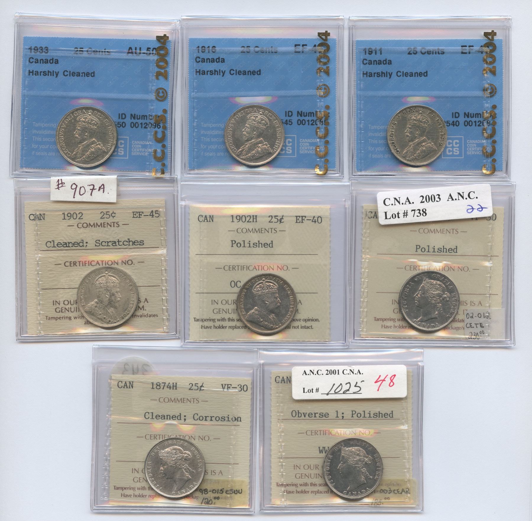 Includes: 1870 ICCS VF-30, obverse 1, polished; 1874H ICCS VF-30, cleaned, corrosion; 1888 ICCS VF-30, polished; 1902H ICCS EF-40, polished; 1902 ICCS EF-45, cleaned, scratches; 1911 CCCS EF-40, harshly cleaned; 1916 CCCS EF-45, harshly cleaned; 1933 CCCS AU-50, harshly cleaned. 8 Pcs.