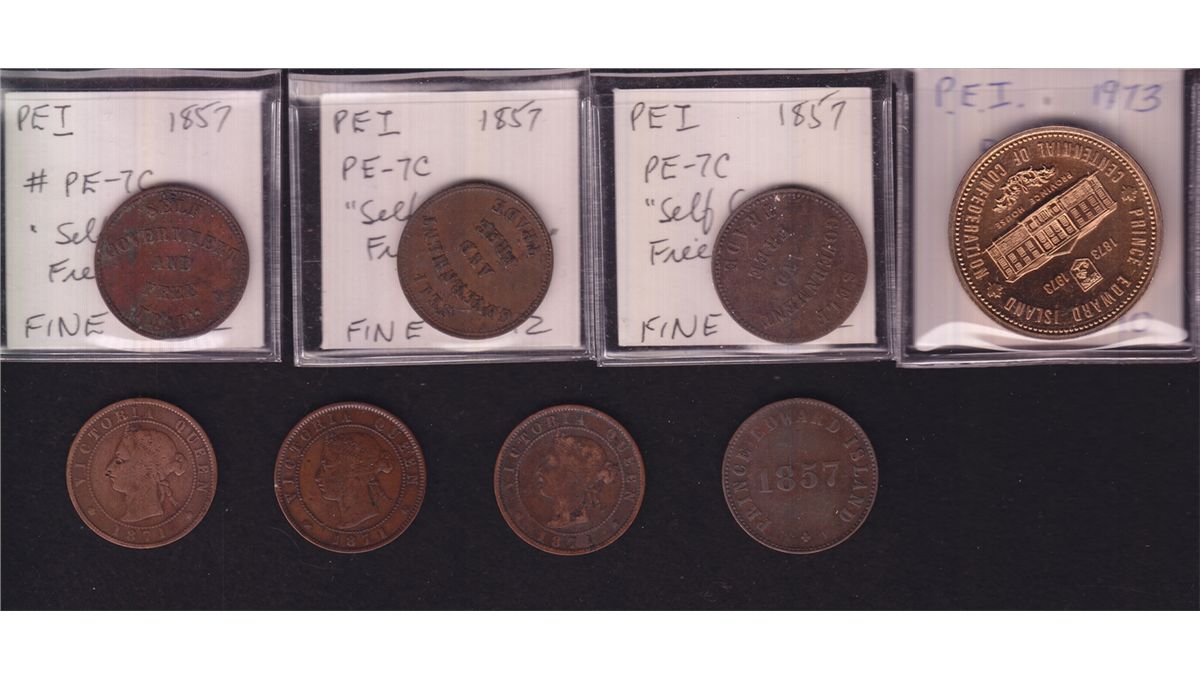 Lot of 8 Prince Edward Island Coins, Tokens, Medal. - Includes: Four PE-7C, grades are all around Fine; Three 1871 Pennies VG/Fine; 1973 Bronze Medal, Cenntenial of Confederation. 8 Pcs.