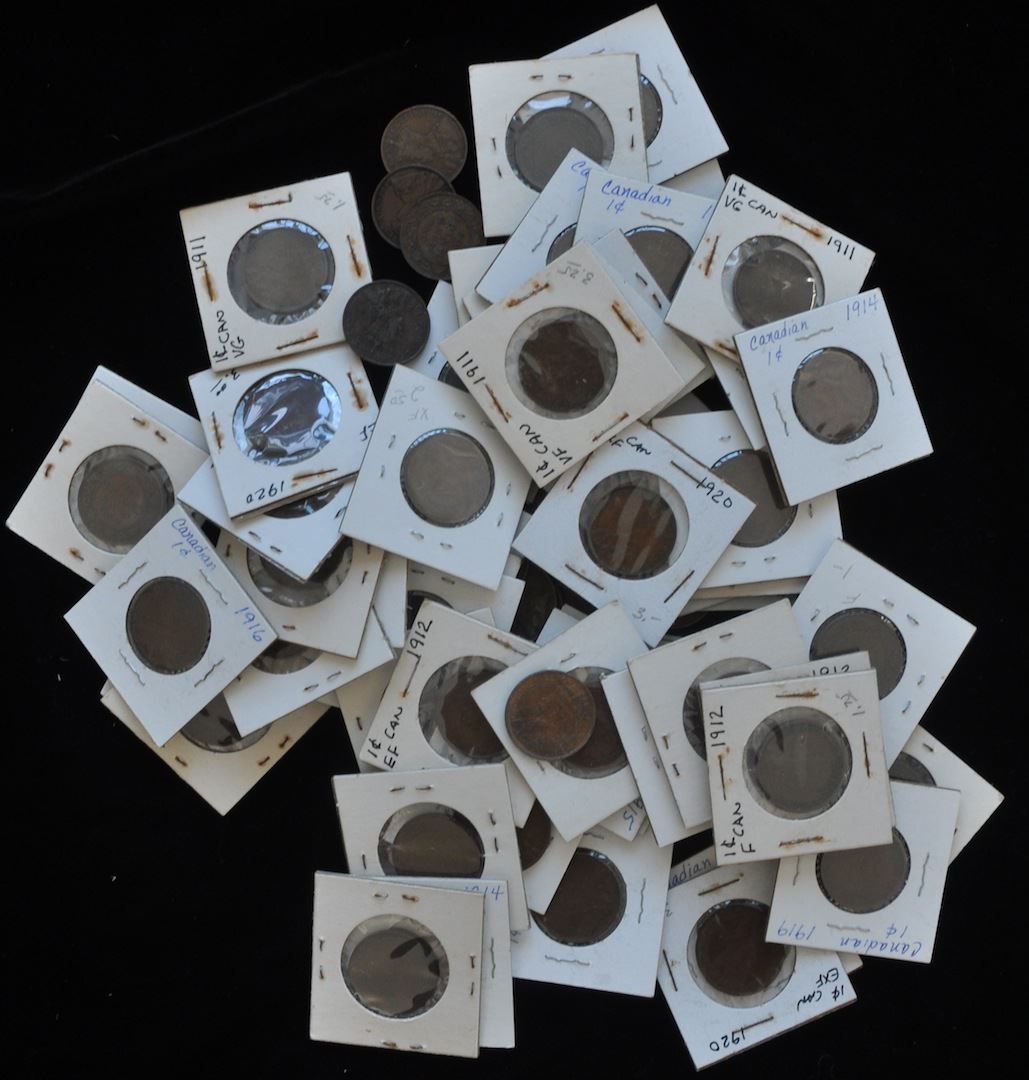 Lot of 89 George V Large Cents Includes: 1911x6, 1912x7, 1913x8, 1914x8, 1915x9, 1916x16, 1917x9, 1918x8, 1919x11, 1920x7. Conditions are decent - F/VF on average, viewing is recommended. 89 Pcs.