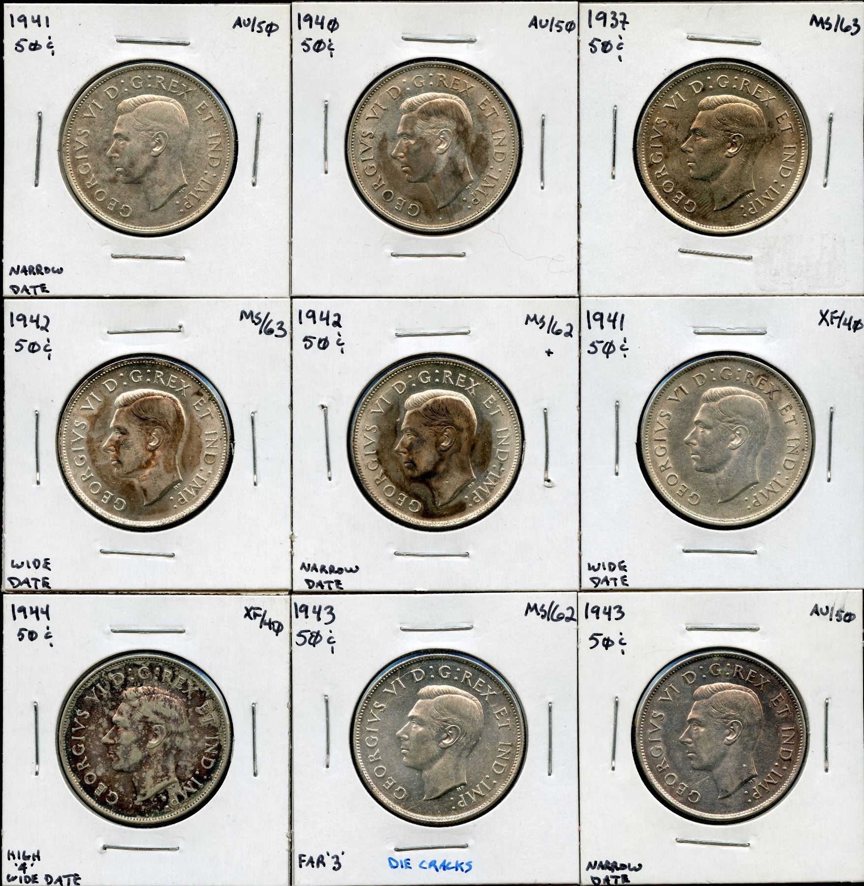 Includes: 1937 MS. 1940 AU. 1941 narrow date, AU. 1941 wide date, EF. 1942 narrow date, MS. 1942 wide date, MS. 1943 narrow date, AU. 1943 Far 3, MS. 1944 wide date, high 4, EF. Viewing is recommended, no return. 9 Pcs.