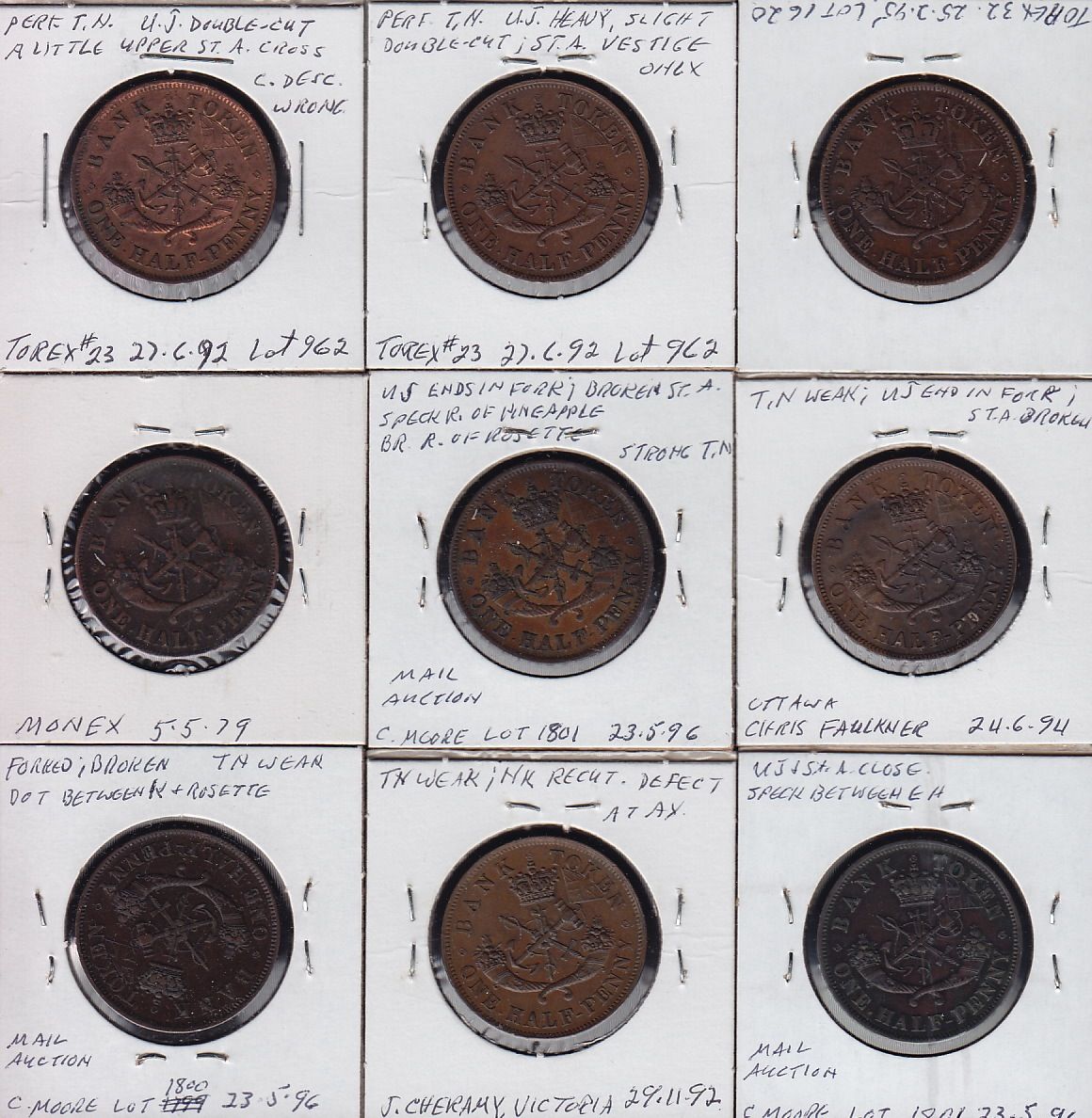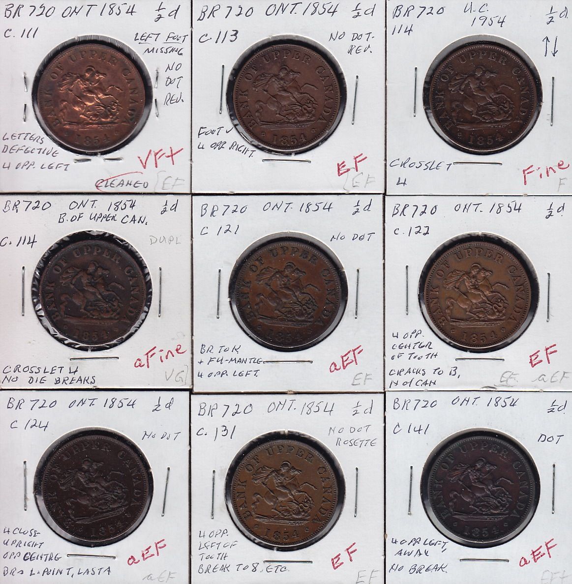 Lot of 9 Province of Canada Tokens - Lot includes: Courteau 111, upset reverse, VF+, once cleaned, but an R.9; Courteau 113, upset reverse, EF (an R.10); Courteau 114, upset reverse, crosslet 4, Fine; Courteau 114, upset reverse, crosslet 4, about Fine; Courteau 121, upset reverse, about EF; Courteau 122, upset reverse, EF; Courteau 124, upset reverse, about EF; Courteau 131, upset reverse, EF; Courteau 141, upset reverse, about EF. 9 Pcs.