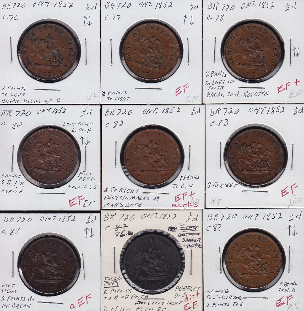 Lot includes: Courteau 76, upset reverse, VF; Courteau 77, upset reverse, EF; Courteau 78, upset reverse, EF+; Courteau 80, upset reverse, VF+; Courteau 82, upset reverse, two carbon spots on obverse, EF+; Courteau 78; Courteau 85, upset reverse, about EF; Courteau 86, upset reverse, EF, dirt; Courteau 87, upset reverse, EF. 9 Pcs.