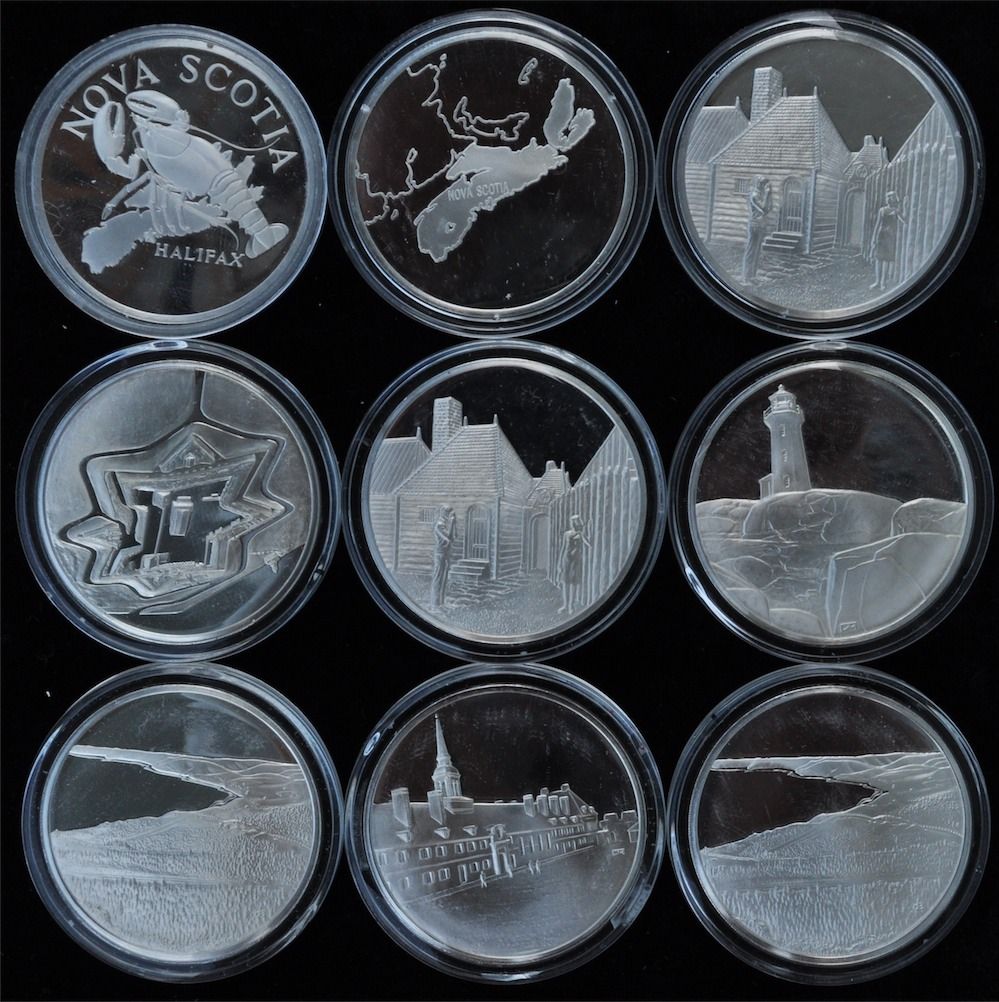 Lot of 9 Sterling Silver Medals - Includes: Seven Great Canadian Landmarks at 40.5 grams each. Two Nova Scotia medals - 31.1 grams each. 10.25 ounces of silver. 9 Pcs.