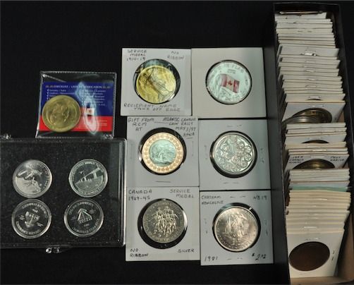 Includes: Three war medals, Centennial Trade Dollars, Tokens, Shell Gas Medallions, and more. Worthy of a look. 54 Pcs.