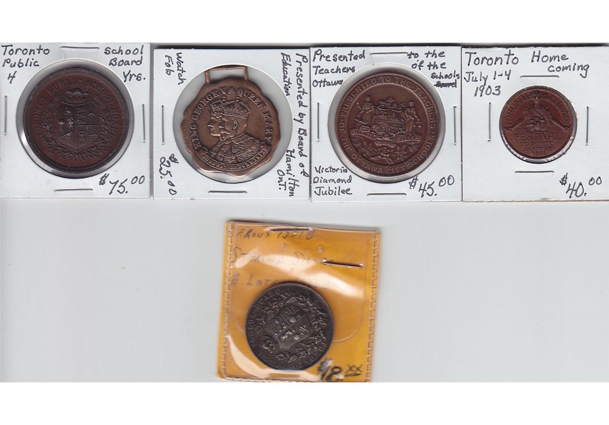 1903 Toronto Home Coming, copper, UNC; Hamilton Board of Education, 1935 George V and Queen Mary, looped at top; 1897 Ottawa Teachers, Victoria diamond jubilee celebration; Toronto Public School Board 6 year copper medal, UNC; Toronto Public School Board silver 8 year medal. 5 Pcs.