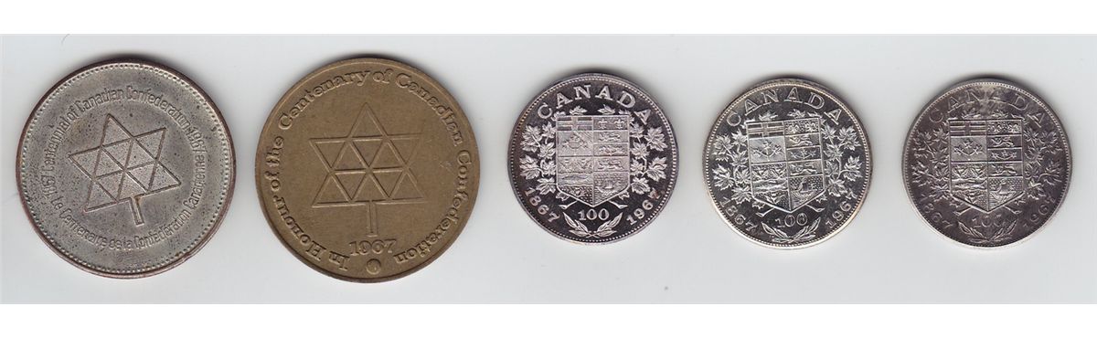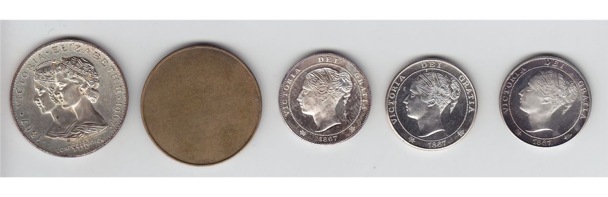 Lot of five: Two Queens, nickel-silver, 38mm, 386gms, Artistic Dies; Mc Tavish medal, .999 silver(3), 30mm, 211 gms, Artistic Dies; brass uniface specimen, Centennial symbol, In Honour of the Centennary of Canadian Confederation, 1967. 5 Pcs.