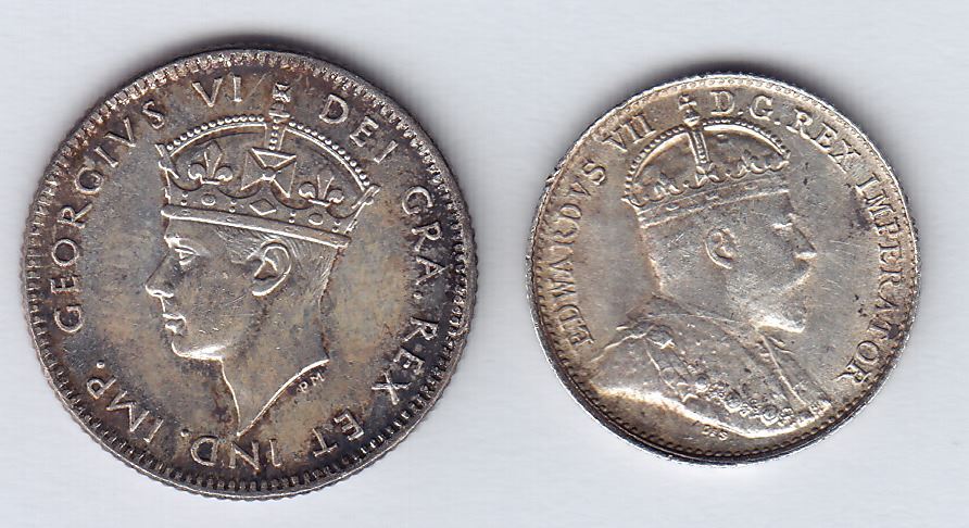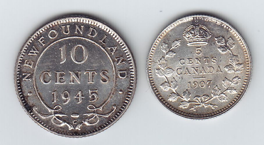Includes: 1945C Newfoundland 10c AU, scratch. 1907 Canadian 5c, AU. 2 Pcs.