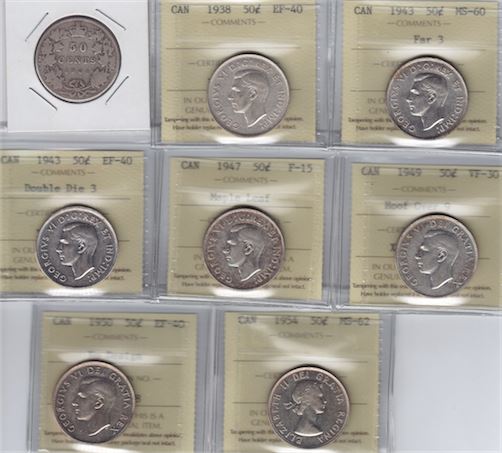 Lot of Eight Fifty Cents Includes: 1901 Good (scratches). Remainder are ICCS Graded: 1938 EF-40, 1943 Far 3 MS-60, 1943 Double Die 3 EF-40, 1947 Maple Leaf F-15, 1949 Hood Over 9 VF-30, 1950 No Design EF-40, 1954 MS-62. 8 Pcs.