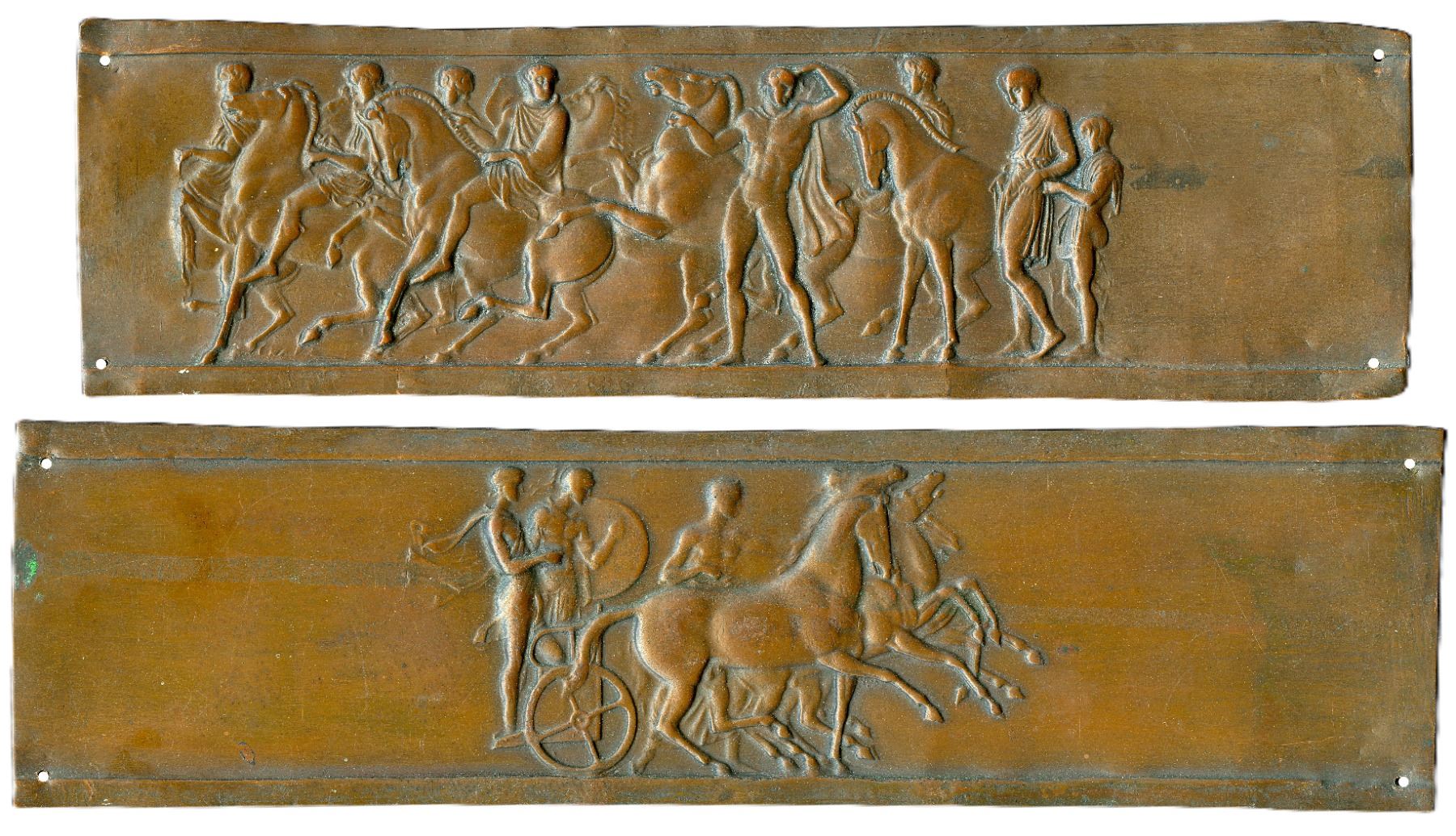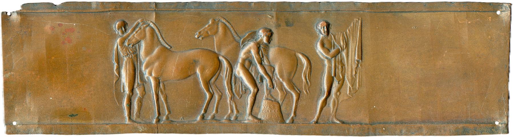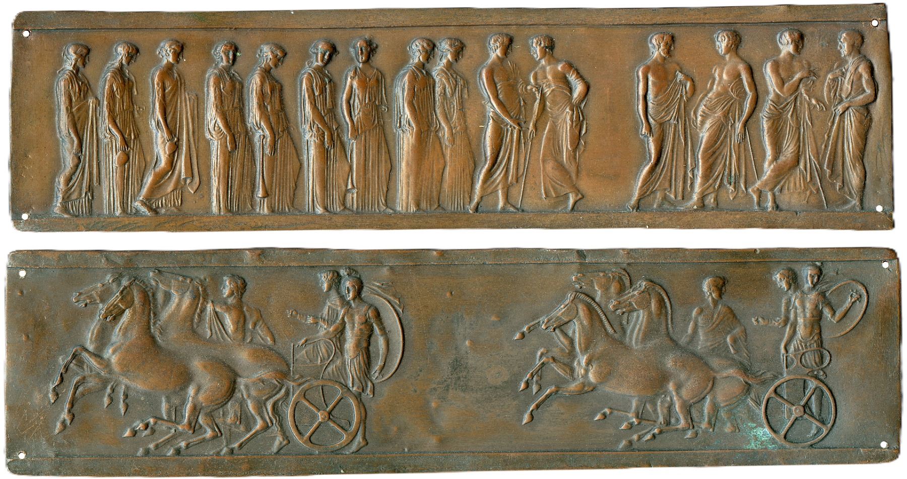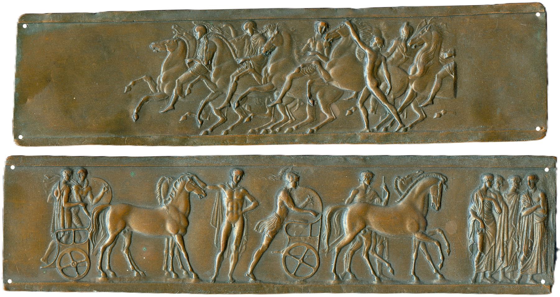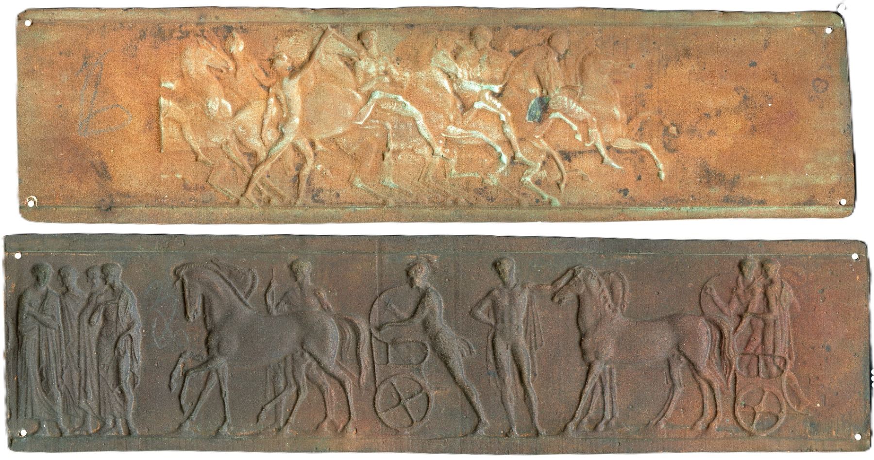 Lot of Eight Mid 19th Century Copper Electrotype Plaques Depicting The Parthenon Frieze By John Henning (1771-1851) And His Son Samuel Henning (1803-1832). The plaques are Copper, the average size is 200 x 56mm. Henning signed the plaque featuring three men and two horses, the signature is seen below the centre man's left foot, dated 1817. Samuel signed the plaque depicting two young men on horseback with a man standing in front, dated 1821. The other six are not signed. The scenes depict the Senate, Centurion soldiers, horses & chariots. During the 18th and 19th centuries the interest in classical sculpture was at its height and many original examples and copies adorned country houses and art academies all over Britain. The famous Parthenon frieze formed part of Lord Elgin's collection of Greek sculpture that was first displayed in England at Elgin's London home on the corner of Park Lane and Piccadilly from 1808 to invited guests. John Henning, a Scottish born artist, was one of the first to access the collection and like most who saw it was struck by the beauty of the pieces. He embarked on a project of making models of the Parthenon and Phigaleian friezes, restoring the missing elements, an undertaking which he felt was not only useful for his own artistic gain, but also for pecuniary reasons. His initial studies in ivory were unsuccessful and so he intaglio carved slate which he used as moulds for plaster casting, producing small tablet sections which were sold in boxes. Working for Josiah Wedgwood at the time, Henning took twelve years to complete the reliefs. EF. 8pcs. Ex. Wm. John Keast (1893-1948)