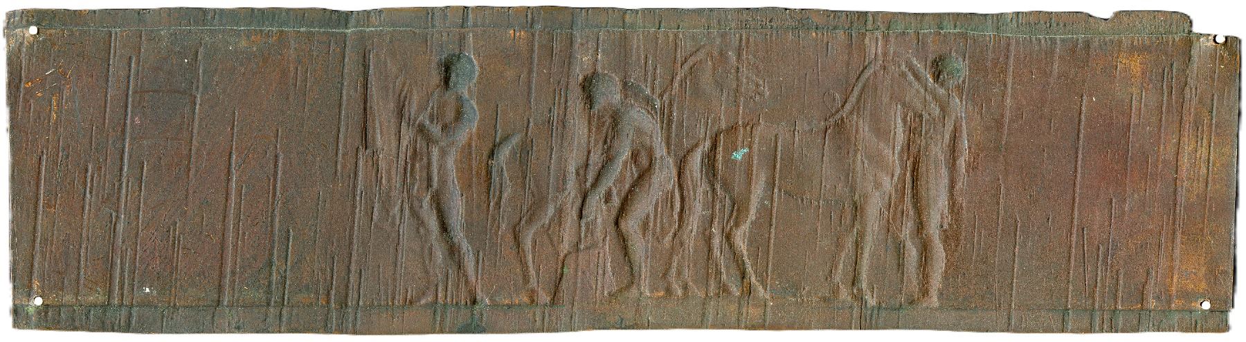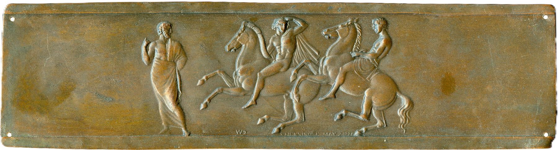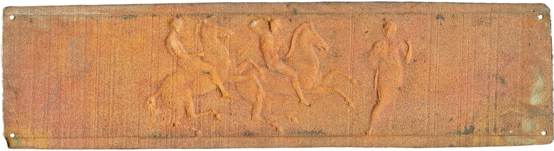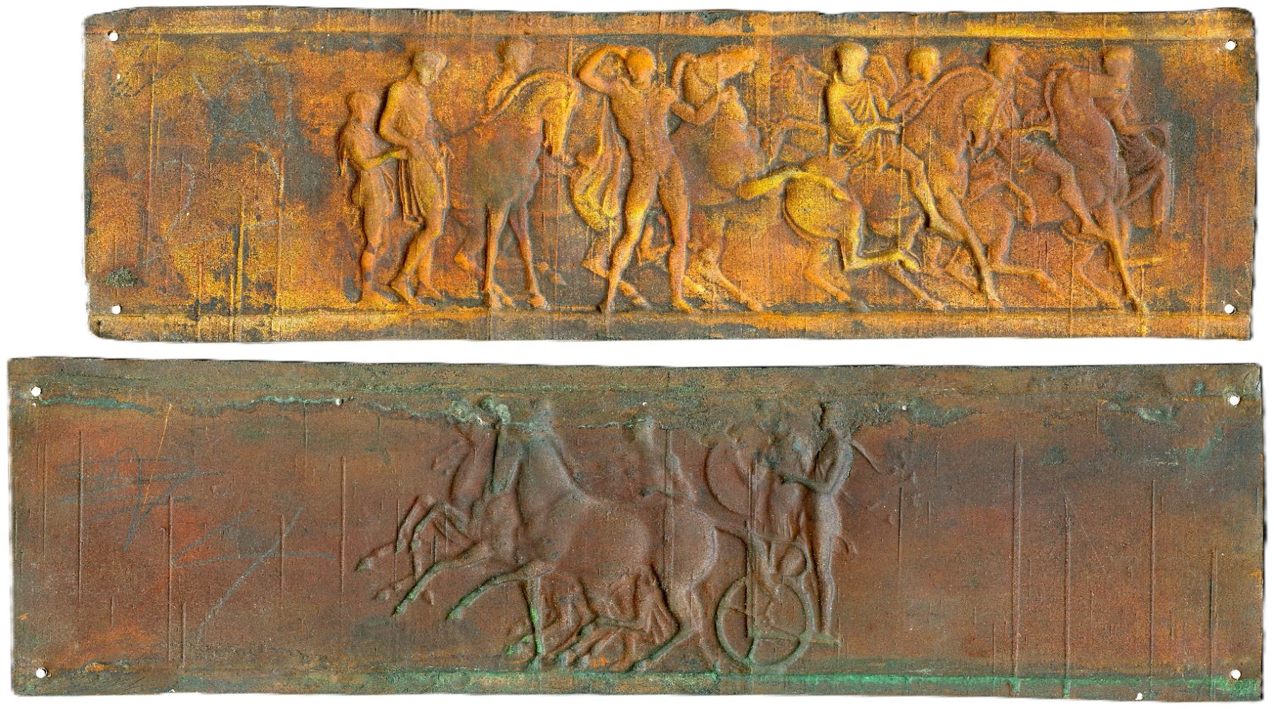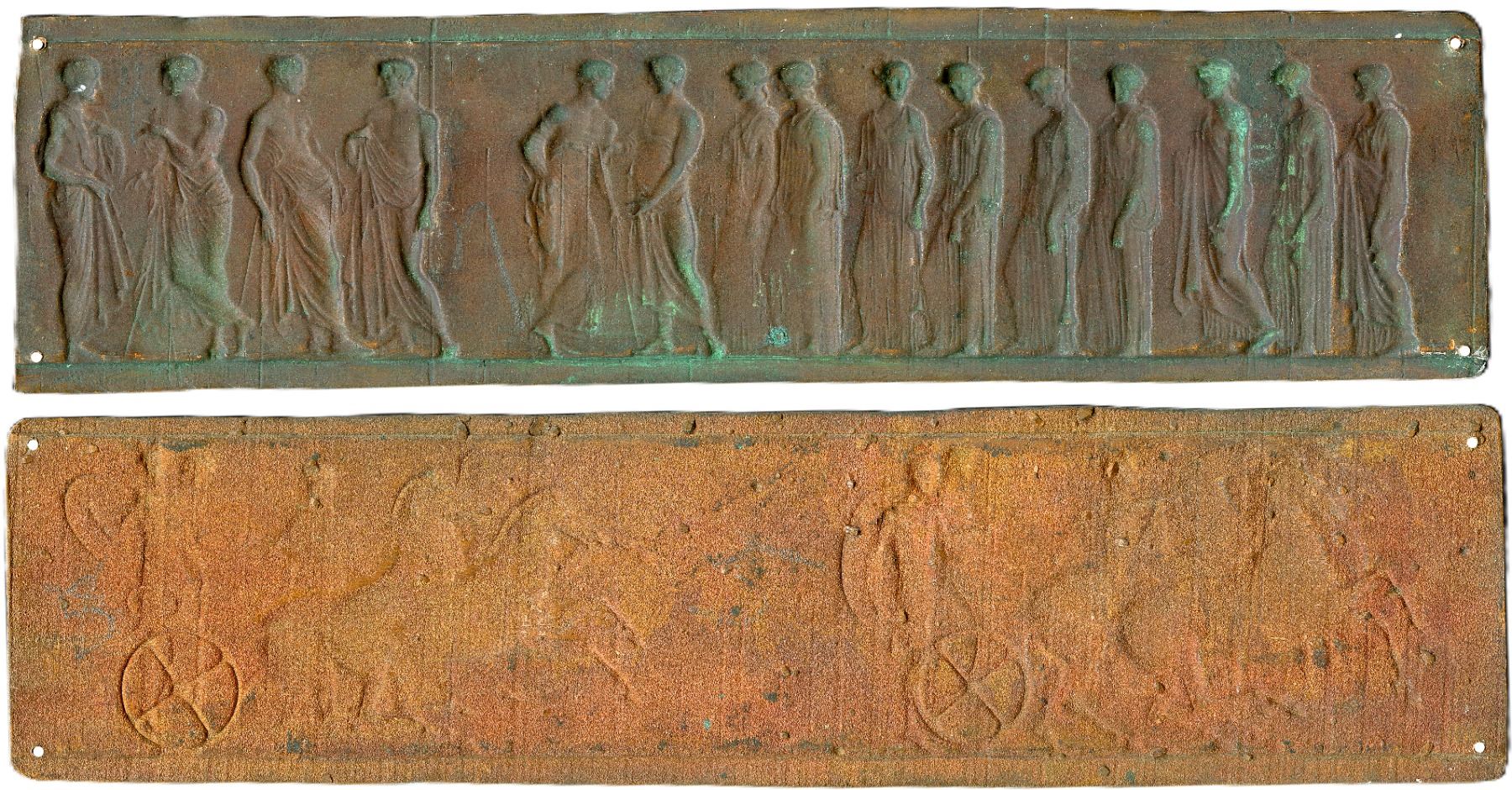 Lot of Eight Mid 19th Century Copper Electrotype Plaques Depicting The Parthenon Frieze By John Henning (1771-1851) And His Son Samuel Henning (1803-1832). The plaques are Copper, the average size is 200 x 56mm. Henning signed the plaque featuring three men and two horses, the signature is seen below the centre man's left foot, dated 1817. Samuel signed the plaque depicting two young men on horseback with a man standing in front, dated 1821. The other six are not signed. The scenes depict the Senate, Centurion soldiers, horses & chariots. During the 18th and 19th centuries the interest in classical sculpture was at its height and many original examples and copies adorned country houses and art academies all over Britain. The famous Parthenon frieze formed part of Lord Elgin's collection of Greek sculpture that was first displayed in England at Elgin's London home on the corner of Park Lane and Piccadilly from 1808 to invited guests. John Henning, a Scottish born artist, was one of the first to access the collection and like most who saw it was struck by the beauty of the pieces. He embarked on a project of making models of the Parthenon and Phigaleian friezes, restoring the missing elements, an undertaking which he felt was not only useful for his own artistic gain, but also for pecuniary reasons. His initial studies in ivory were unsuccessful and so he intaglio carved slate which he used as moulds for plaster casting, producing small tablet sections which were sold in boxes. Working for Josiah Wedgwood at the time, Henning took twelve years to complete the reliefs. EF. 8pcs. Ex. Wm. John Keast (1893-1948)