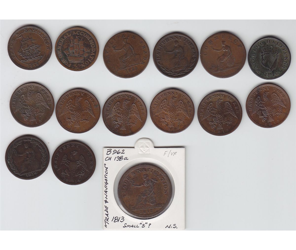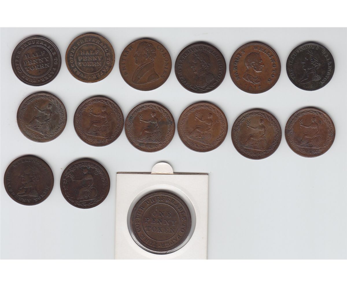 Lot includes: Br 962, 1813 Trade & Navigation Token, F. Br 965, 1812 Half Penny Trade and Navigation Token, EF. Br 966, General Accommodation Half Penny Token, VG. Br 971, Half Penny Wellington Token, F. Br 978, Marquis Wellington Commerce Token, VG. Br 979, Wellington Half Penny Token, VG. Br 981, 1816 Waterloo Half Penny Wellington Token, VF. Br 993, British Colonies to Facilitate Trade Token, F. (7) Br 994, 1815 Half Penny Eagle, F-EF. 15 Pcs.