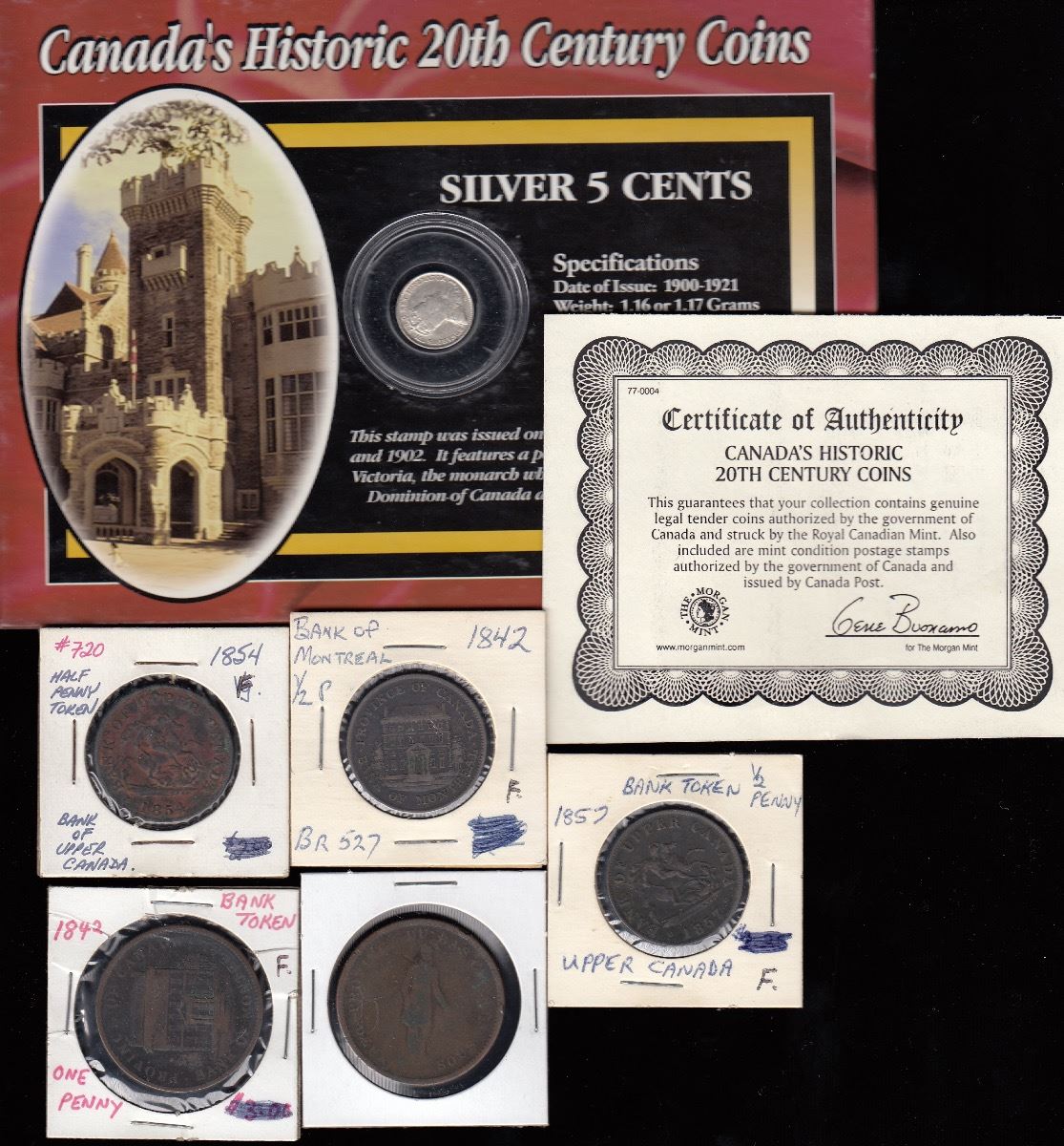 Lot of Five Canadian Tokens & 1910 Silver Five Cents & Stamp Historic Package - Lot includes: Province of Canada One Penny token, 2 x Upper Canada halfpenny tokens, Bank of Montreal halfpenny token and Banque du Peuple One Penny token. Low grade, please view, no returns. 6 Pcs.