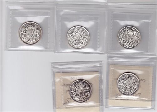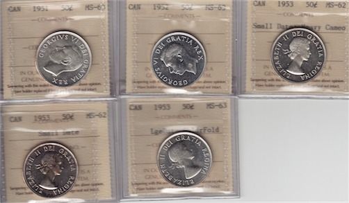 Dates include: 1951, MS-63. 1952, MS-63. 1953 Sm. Date; HC, MS-62. 1953 Lg. Date; SF, MS-63. 1953 Sm. Date, MS-62. 5 Pcs.