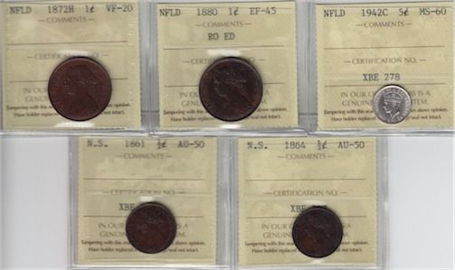 1872H NFLD One Cent, VF-20. 1880 NFLD One Cent EF-45, RO ED. 1942C NFLD Five Cent, MS-60. 1861 Nova Scotia Half Cent, AU-50. 1864 Nova Scotia Half Cent, AU-50. 5 Pcs.