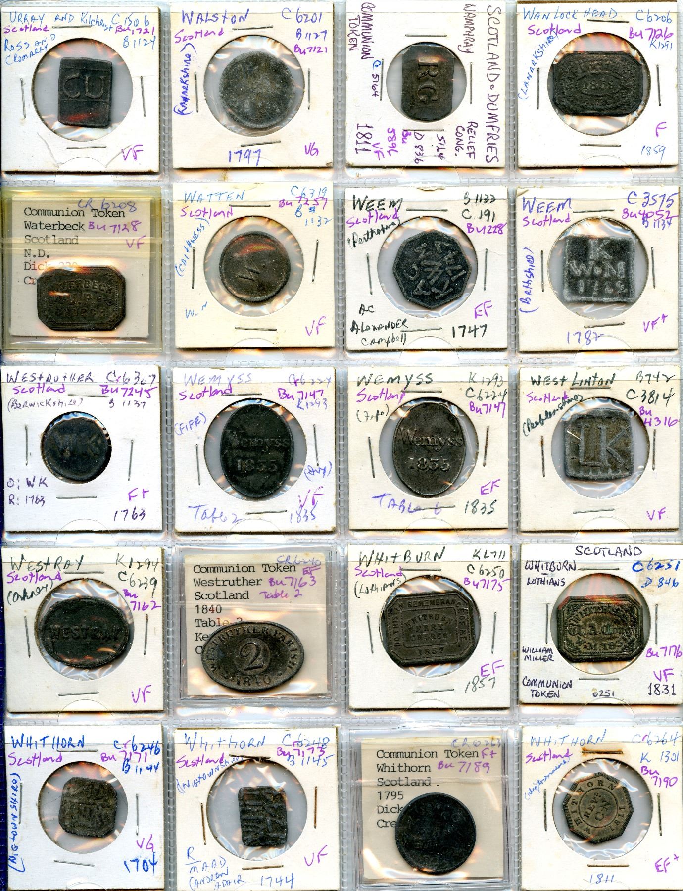 Includes: URRAY & KILCHRIST, Bu 1721, Cr 1506; WALSTON, Bu 7121, Cr 6201; WAMPHRAY, Bu 5896, Cr 5164; WANLOCKHEAD, Bu 7126, Cr 6206; WATERBECK, Bu 7128, Cr 6208; WEEM, Bu 228, Cr 191; Bu 4052, Cr 3575; WESTRUTHER, Bu 7245, Cr 6307; WEMYSS, Bu 7147, Cr 6224; Bu 7147, Cr 6224; WEST LINTON, Bu 4316, Cr 3814; WESTRAY, Bu 7162, Cr 6239; WESTRUTHER, Bu 7163, Cr 6240; WHITBURN, Bu 7175, Cr 6250; Bu 7176, Cr 6251; WHITHORN, Bu 7171, Cr 6246; Bu 7173, Cr 6248; Bu 7189, Cr 6263; Bu 7190, Cr 6264; WHITSOME, Bu 7188, Cr 6262; Bu 7239, Cr 6301; WICK, Bu 7211, Cr 6283; WIGTOWN, Bu 7214, Cr 6286; WILTON, Bu 7219, Cr 6291; Bu 7246, Cr 6308; WISHAW, Bu 7227, Cr 6294; YARROW, Bu 7280, Cr 6337; YESTER, Bu 7281, Cr 6338; YETHOLM, Bu 7282, Cr 6339; Bu 7283, Cr 6340; Bu 7286, Cr 6343; KILBRANDON & KILCHATTAN, Bu 6221, Cr 5425; STOCK TOKENS USED IN SCOTLAND, Bu 7491, Cr 64654; Bu 7501, Cr 6458; Bu 7510, Cr 2355; Bu 7526, Cr 6482; Bu 7575, Cr 6455 (4pcs); Bu 7576; Bu 7598, Cr 6483. VG to EF. Viewing is highly recommended. 43pcs.