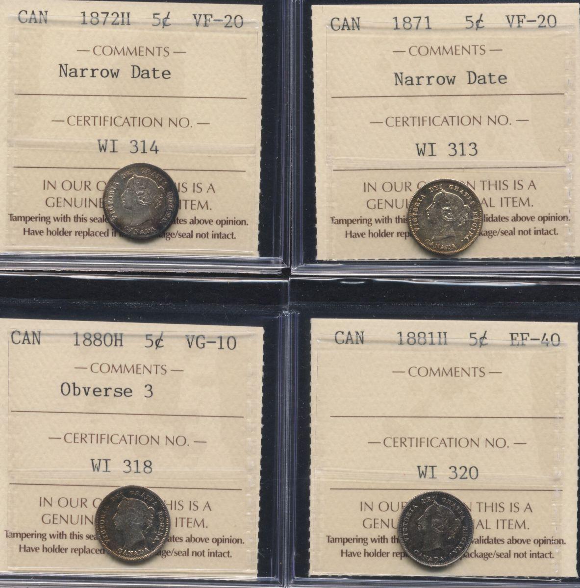 ICCS graded: 1871 Narrow Date VF-20, 1872 H Narrow Date VF-20, 1880 H Obv. 3, VG-10; 1881 H, EF-40