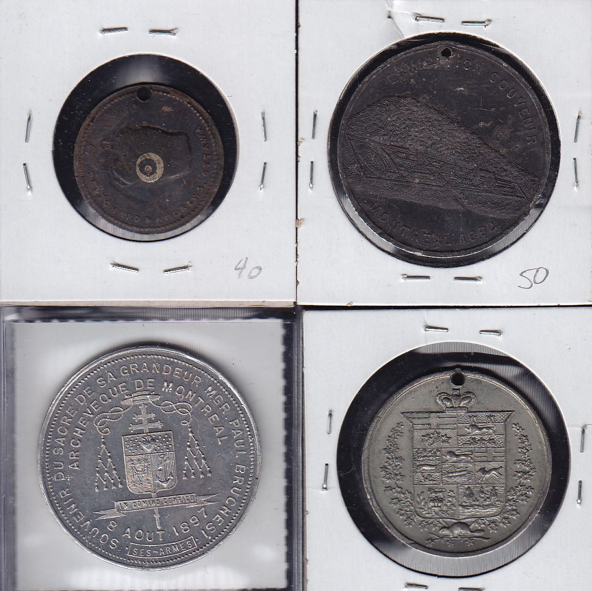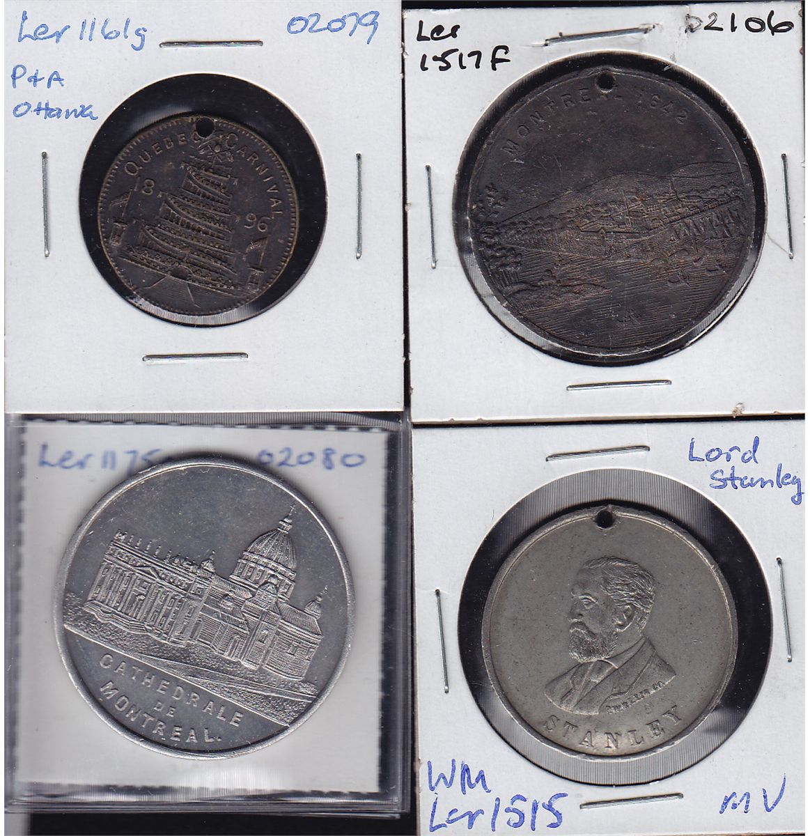 Lot of Four Leroux Medals - 1 - Leroux 1161g Quebec Carnival 1896. Brass, damage on reverse, top holed. VF. 2 - Leroux 1175a Cathedral of Montreal 1897, AL. UNC. 3 - Leroux 1515 Lord Stanley. WM, VF. 4 - Leroux 1517f Exhibition Souvenir, Montreal. Brass, holed. VF. 4 Pcs.