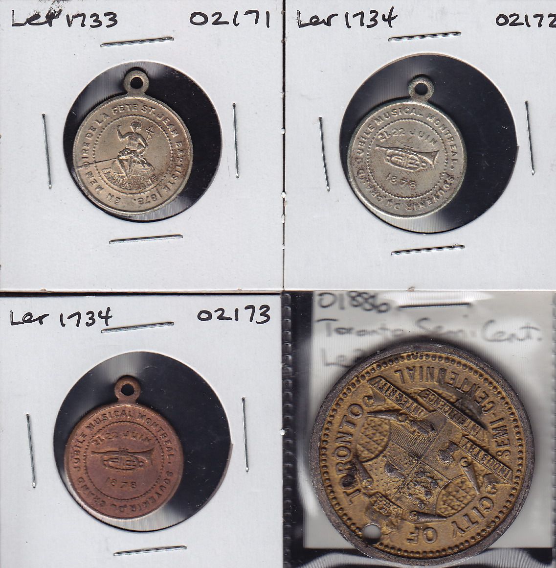 Lot of Four Leroux Medals - 1 - Leroux 1733 St. Jean Baptist Montreal, PQ. WM, AU. 2 - Leroux 1734 Grand Jubilee Musical, Montreal, PQ. WM, looped, AU. 3 -Leroux 1734 Grand Jubilee Musical, Montreal, PQ. CU, looped, AU. 4 - Leroux 1818 Toronto Semi-Centennial. Brass (plated) EF. 4 Pcs.
