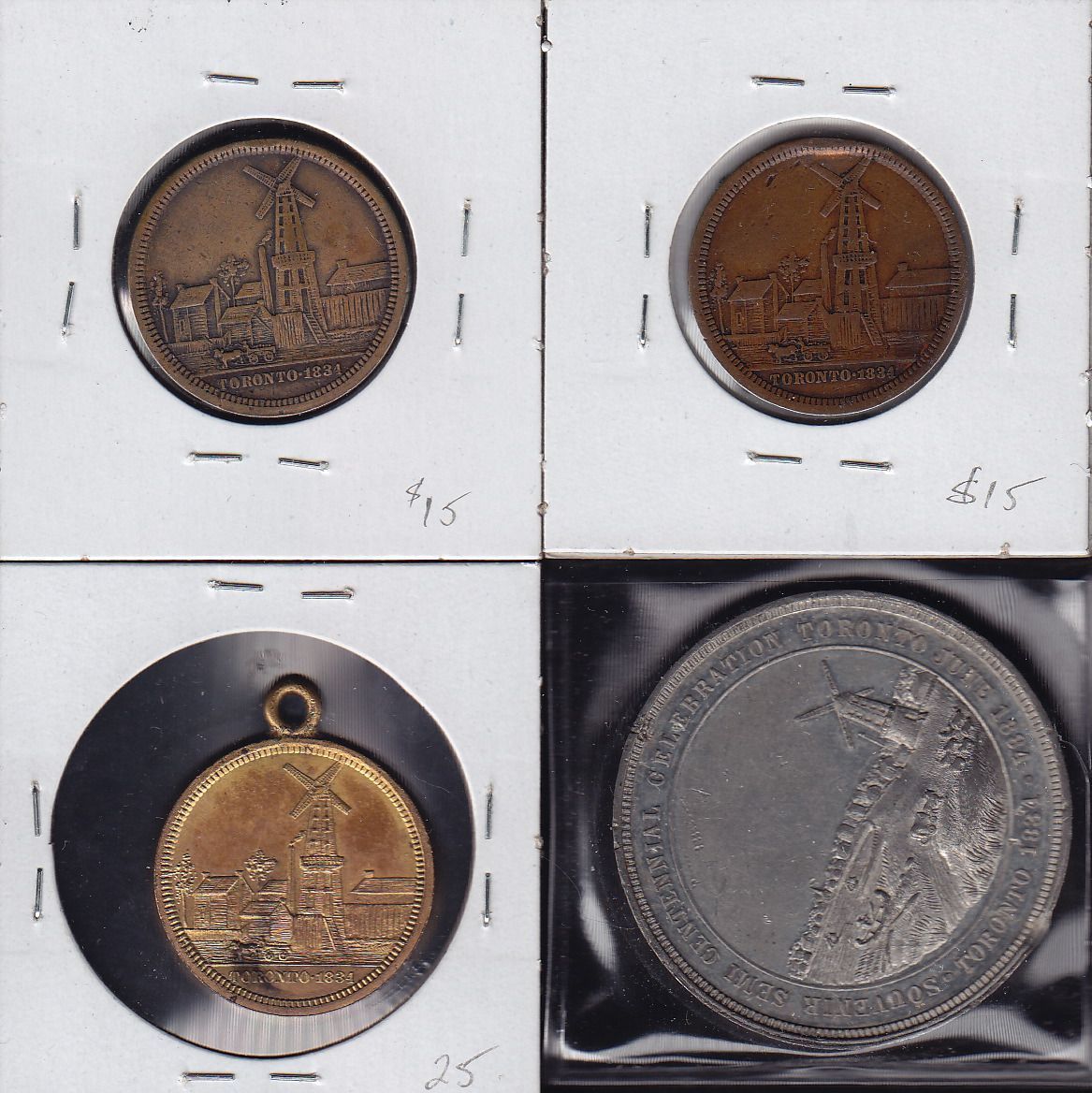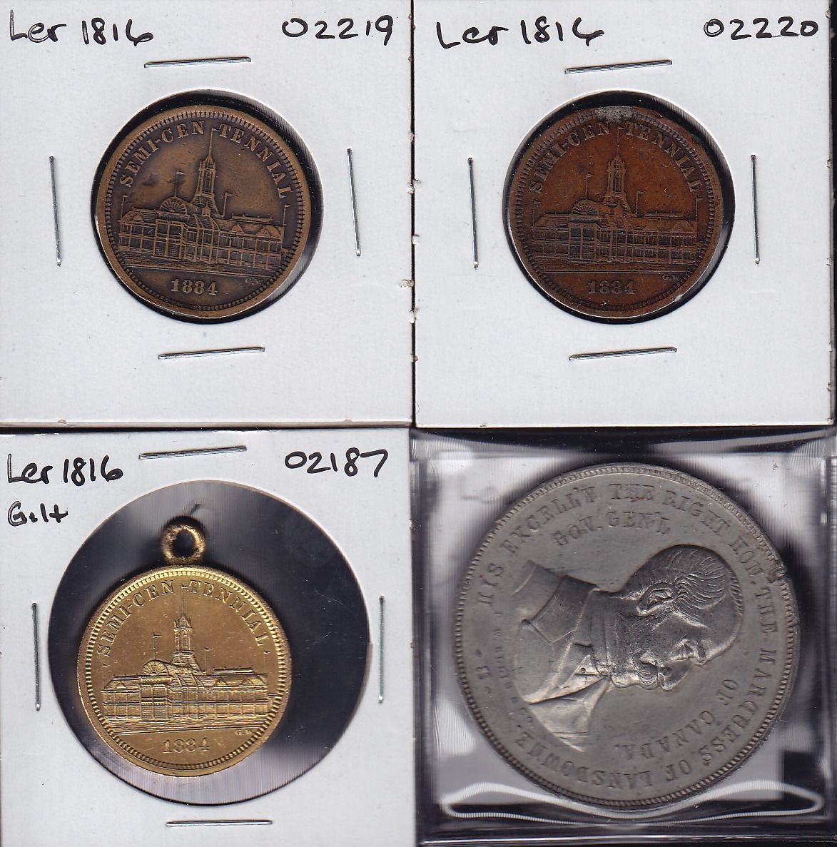 Lot of Four Leroux Medals - 1 - Leroux 1816 Toronto Semi-Centennial. Copper, VF. 2 - Leroux 1816 Toronto Semi-Centennial. Brass, EF. 3 - Leroux 1816 Toronto Semi-Centennial. Gilt, looped. UNC. Leroux 1817 Marquis of Lansdowne 1884. WM, EF. 4 Pcs.