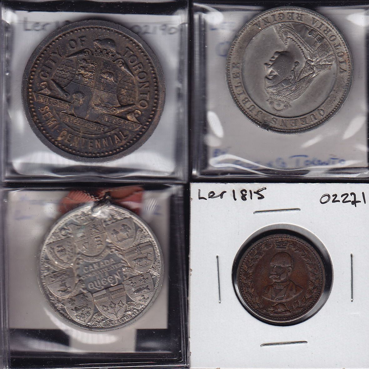 Lot of Four Leroux Medals - 1 - Leroux 1818 Toronto Semi-Centennial. Brass (plated) EF. 2 - Leroux 1871 Queen Victoria's Jubilee. WM, EF. 3 - Leroux 1875n, 1897 Queen Victoria's Diamond Jubilee. WM, AU. 4 - Leroux 1815 Toronto Semi-Centennial, brass or copper, AU. 4 Pcs.