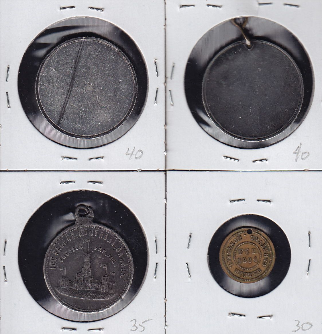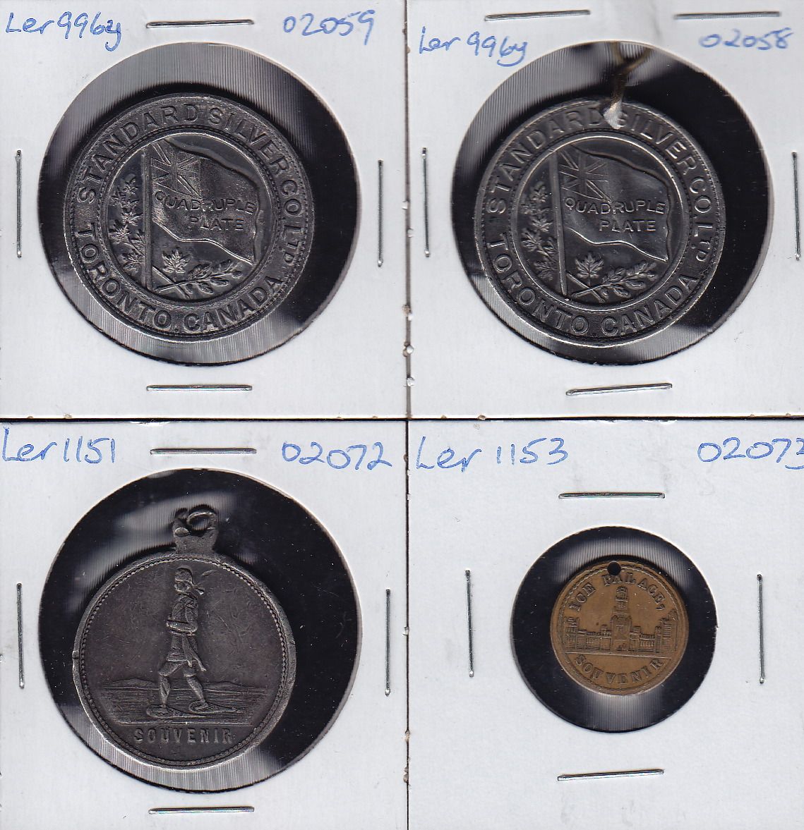 Lot of Four Leroux Medals - 1 - Leroux 996y Standard Silver Co. Toronto, ON. WM, EF. 2 - Leroux 996y Standard Silver Co. Toronto, ON. WM, looped. EF. 3- Leroux 1151 Ice Palace, Montreal, PQ. WM, looped, EF. 4 - Leroux 1153 Ice Palace, Montreal, PQ. Brass, holed, EF. 4 Pcs.